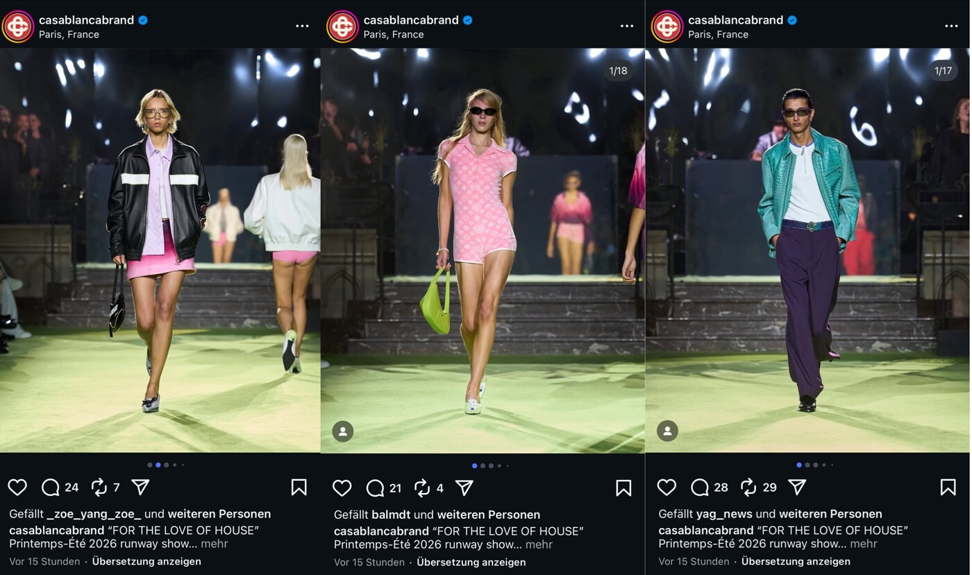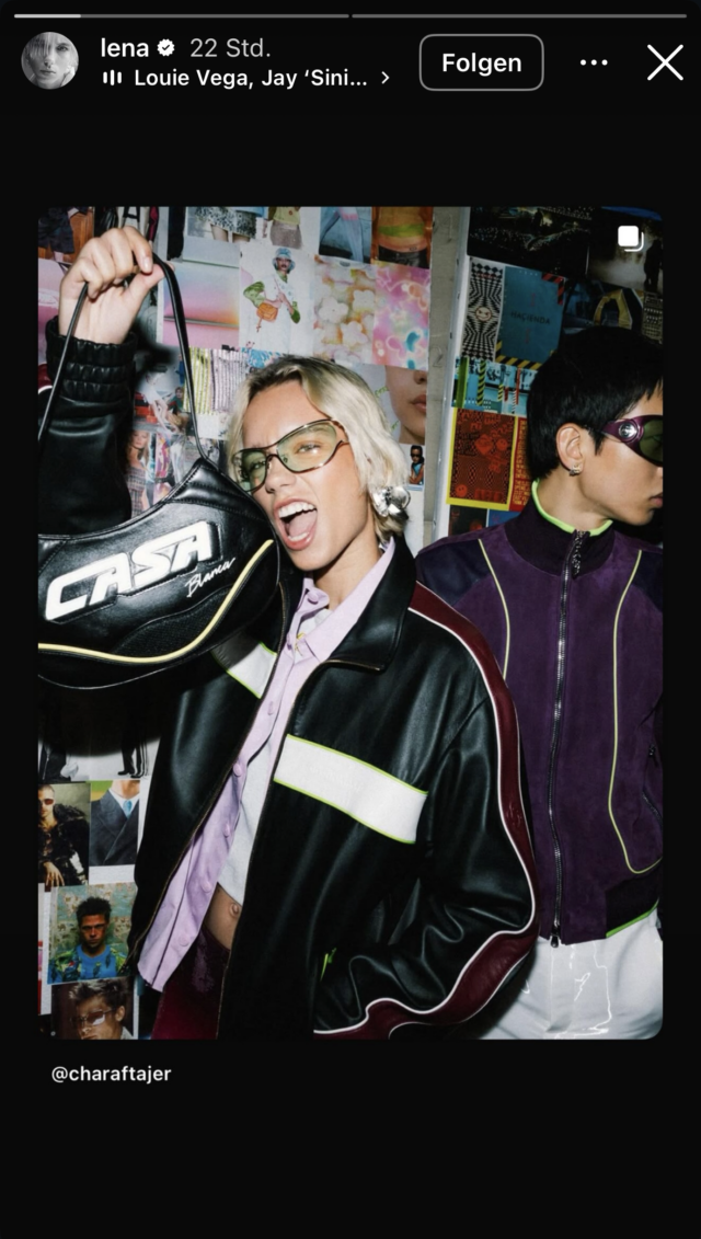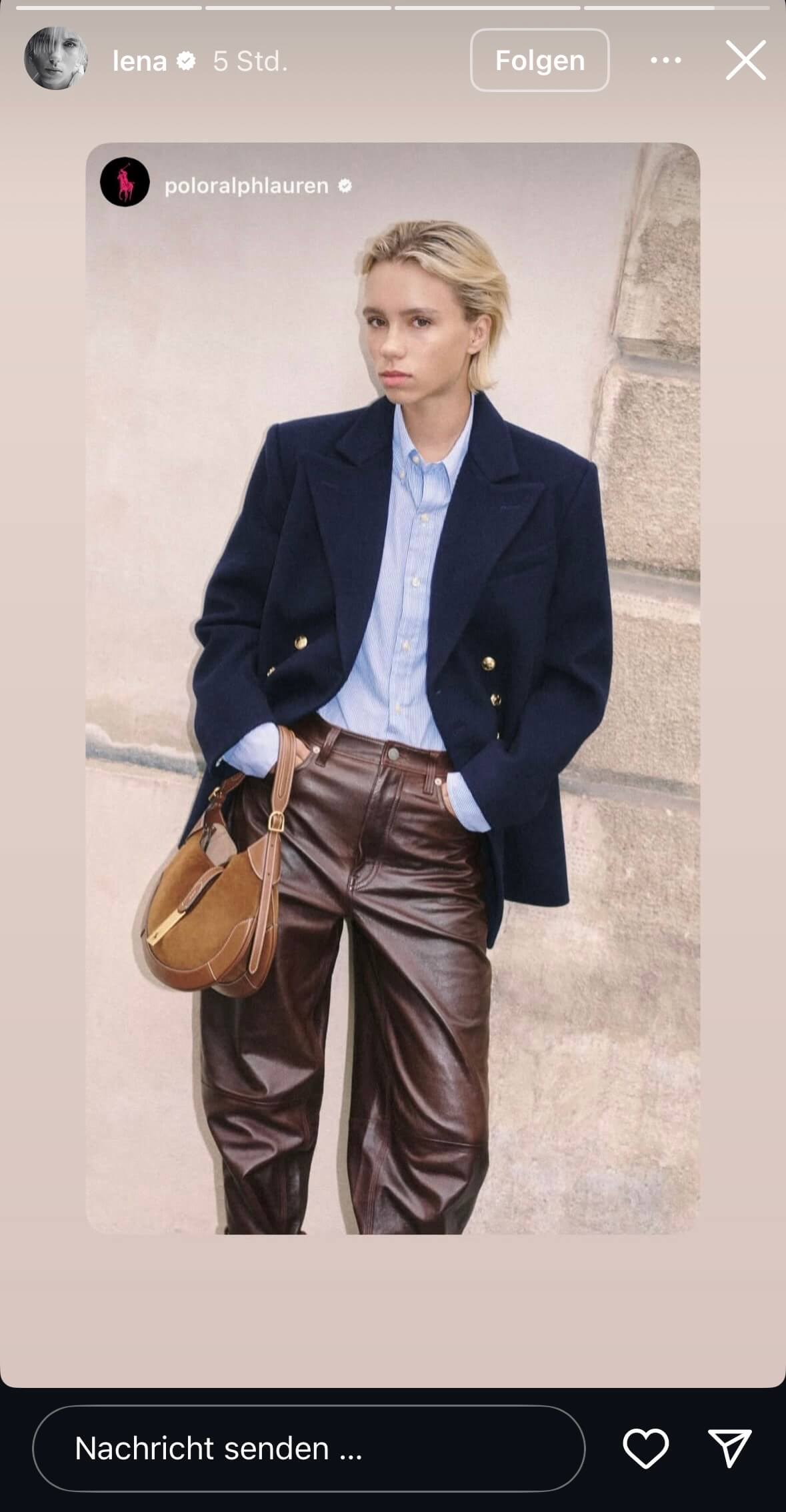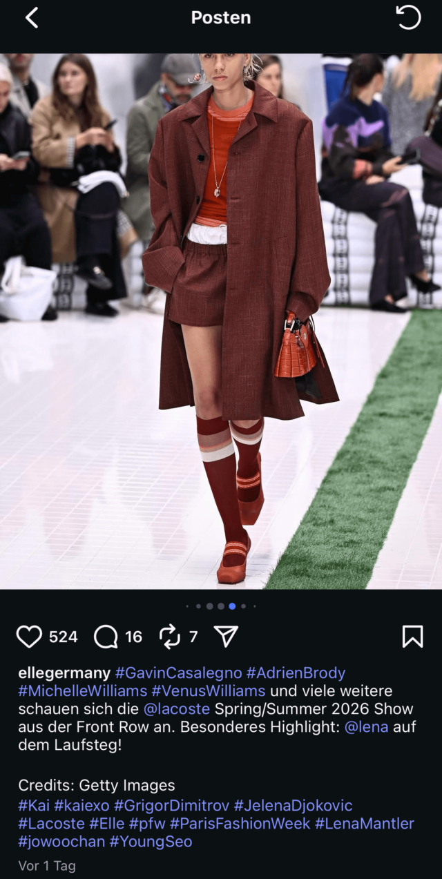 Lena ist gerade in Paris und läuft für diverse Luxus-Marken auf deren Shows – kommuniziert wird wie immer nichts dazu. Stattdessen teilt sie brav alle Postings, in denen sie verlinkt wurde. Bisher haben diese Shoutouts kaum jemanden dazu gebracht, bei ihren Werbepartnern vorbeizuschauen – und am Montag läuft es genau so: Storys werden kommentarlos geteilt, dazu zwei Kooperationen im Feed gepostet, einmal als Ralph-Lauren-Reel, einmal Fotos für Lacoste. Trotz Flops der jeweiligen Kooperationen in der Vergangenheit (unter dem Posting verlinkt) wurde sie offensichtlich erneut gebucht.