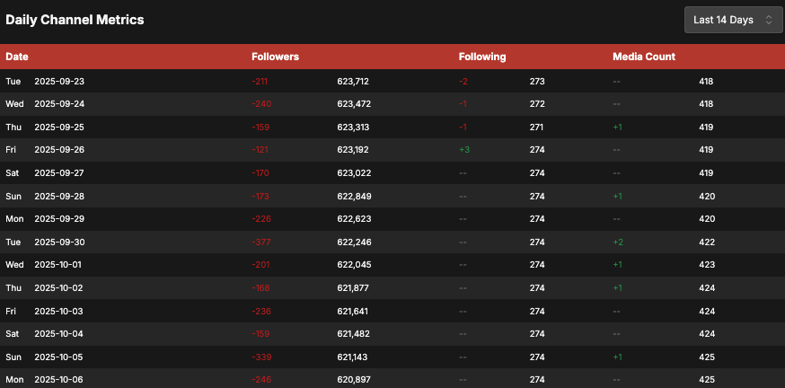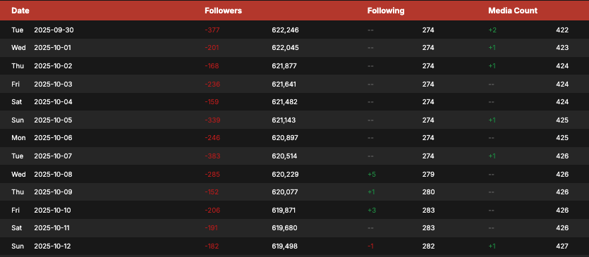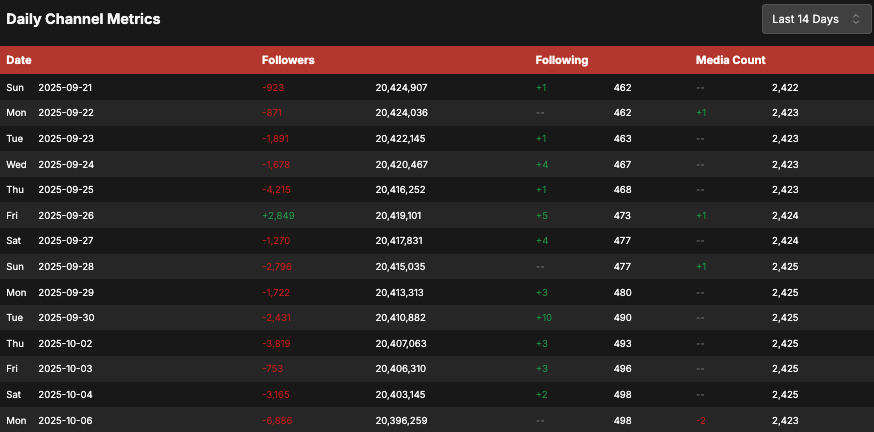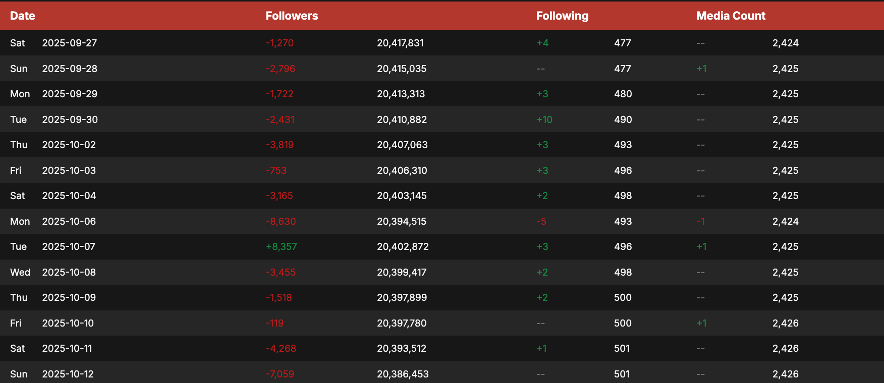 Abschließend das Sahnehäubchen dieser Woche: Lena’s Follower-Show! Über 18.000 Bots sind weg, allein am Sonntag verliert sie stolze 7000 Follower – und die „20.4 Millionen“-Illusion schrumpft auf 20.3 Millionen. Seit Anfang August hat sie über 100.000 Follower verloren! Ein Abgang mit Ansage – nur auf den Laufstegen dieser Welt haben sie das noch nicht gecheckt.