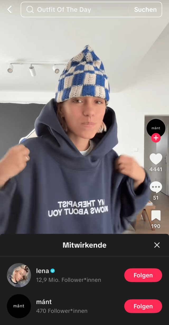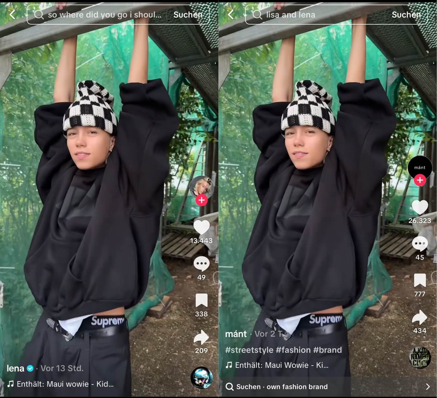 Wie bereits am Mittwoch angedeutet, wird auf dem TikTok Account von „Lena´s“ Marke nun massiv mit Collabs und Querverweisen versucht Follower aufzubauen. Lena postete diese Woche diverse Videos mit ihren Klamotten – wie üblich als #ootd getarnte Schleichwerbung – und nervt jetzt ihre letzten noch verbliebenen echten Follower damit. Teilweise wurde auch zudem derselbe Content bei ihr und bei der Marke hochgeladen. Obwohl alles absichtliche Markenplatzierungen waren, trägt keines der Videos eine Werbekennzeichnung und es wird wieder Musik aus dem unkommerziellen Katalog verwendet.