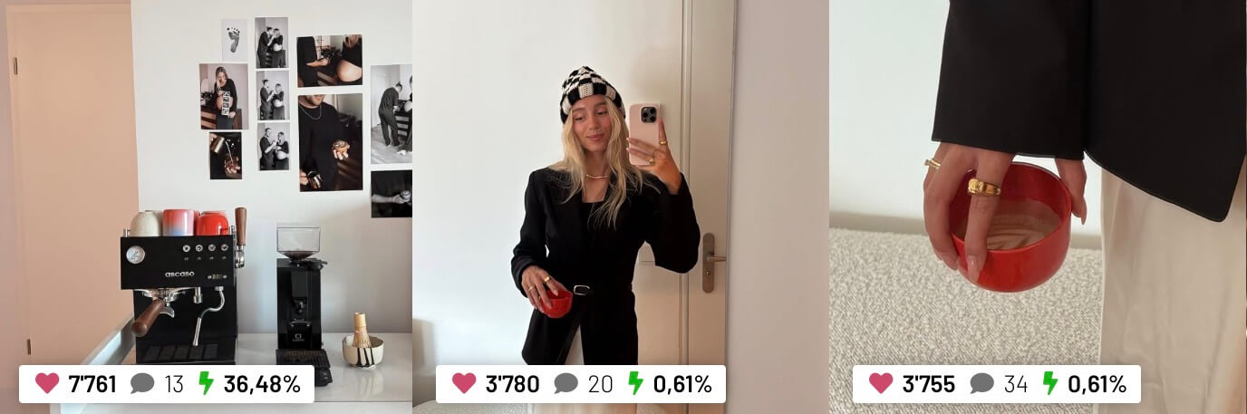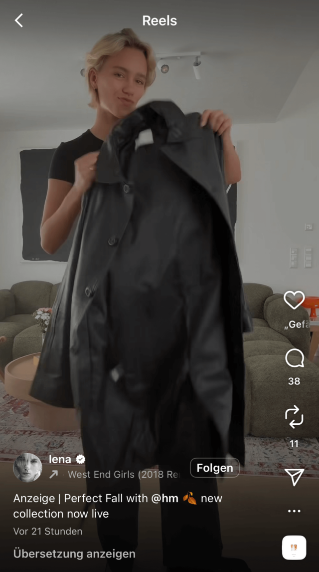 Am Dienstag läuft bei Lena wieder das gewohnte Programm: massenhaft Story-Reposts von Influencern, die brav ihre Gratispakete ausgepackt haben. Und wer taucht in den geteilten Storys auf, die auch das Label fleißig repostet? Richtig, wieder die altbekannte Runde aus Agenturmitarbeitern und den „Freunden“, also die die unter jedem ihrer Posts kommentieren. Alles bleibt also schön in der Familie. Als Krönung des Tages wird ein neues Reel gepostet … Klamotten-Werbung für H&M ist an der Reihe! Worte dazugibt es keine, nur neue Marke – neues Glück … das wird wieder nix! Wetten!?