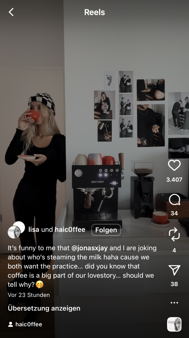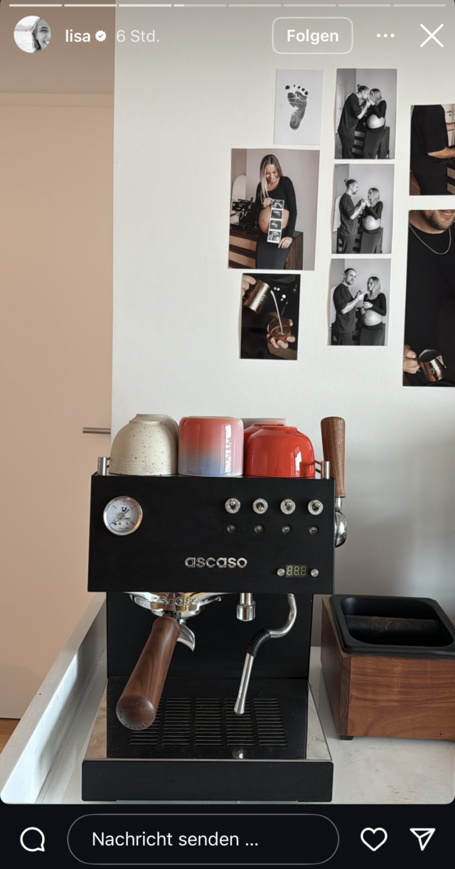 Es ist Mittwoch und die Klamotten-Werbeshow bei Lisa geht in die nächste Runde. Heute wurde Hubby mit eingekleidet und ins Bild gelassen. Gestern wie heute werden also diverse Klamotten in der Story gezeigt und danach als Collab-Reel gepostet – klar, Hubby ist ja jetzt in derselben Agentur, wie unsere beiden Superstars und wird mit vermarktet. Das Klamotten-Reel bekommt die gesponserte Kaffeemaschine als Startbild platziert.