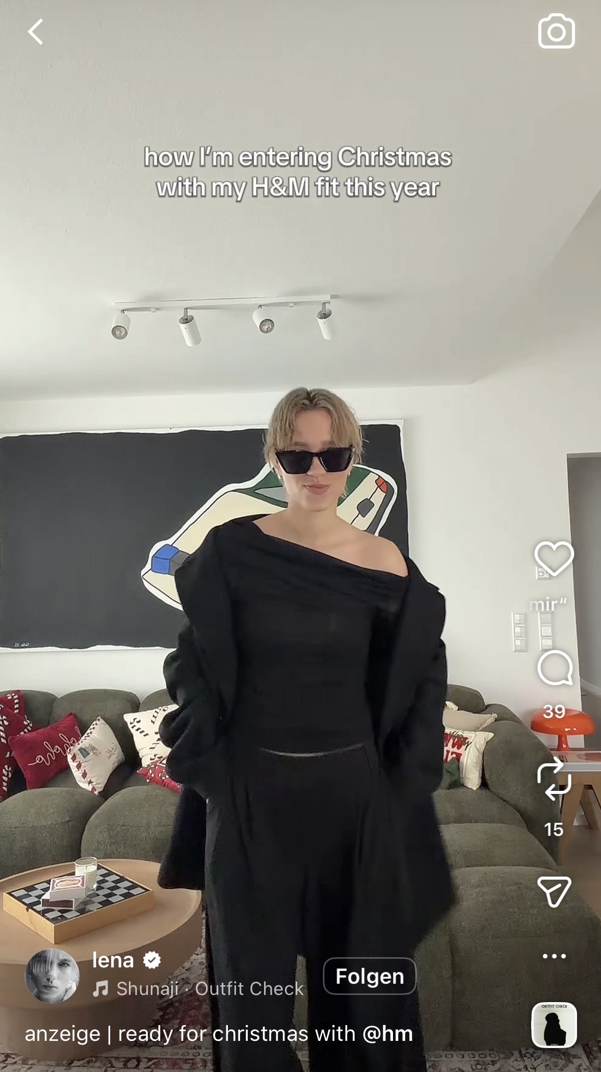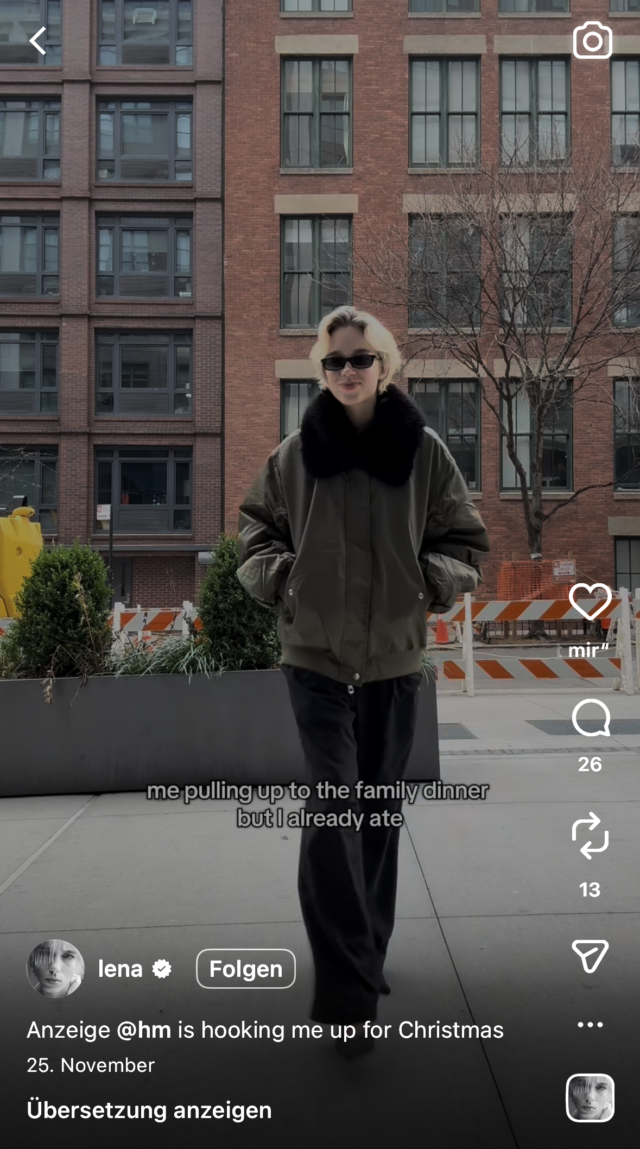 Am Dienstag direkt nächste Werbung. Flop by Flop geht es ungeniert einfach weiter! Heute kommt bei Lena ein neues Reel an den Start („ready for christmas with H&M„), eine Kooperation mit H&M Klamotten. Lena dreht sich in Slowmo in ihrer gesponserten Wohnumgebung und mit Luxus Sonnenbrille auf eine Runde, das wars … unterlegt wird das ganze mit kommerzieller Musik. Gesagt dazu natürlich wird nichts!