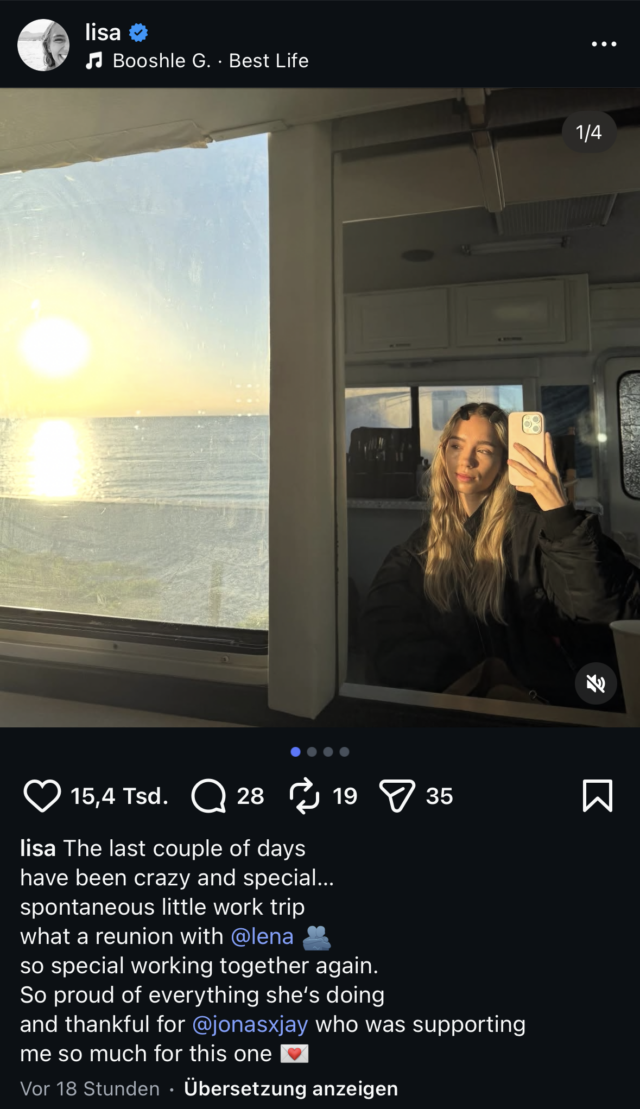Am Samstag steht bei Lisa das nächste Event in ihrem Studio an bzw. hat es jemand für ein Event gemietet, also wird wieder alles endlos in der Story und als Reel kreuz und quer schleichbeworben. Marken sind zu sehen und werden markiert, … klar auch die gesponserte Kaffeemaschine, die gesponserte Keramik und das beworbene Sofa sind wieder mit Start. Es nervt nur noch! Es gipfelt schließlich in einem weiteren Feed-Post – der wieder ganz schnell die 10.000 Likes Grenze geknackt hat … bei nur 15 (!) Kommentaren. LOL! Bei Lena gibt es – was auch sonst – neue stupide Klamotten im gewohnten Kurzvideo-Style schleichbeworben … ebenfalls mit dem üblichen kargen Engagment. Gäähhn!