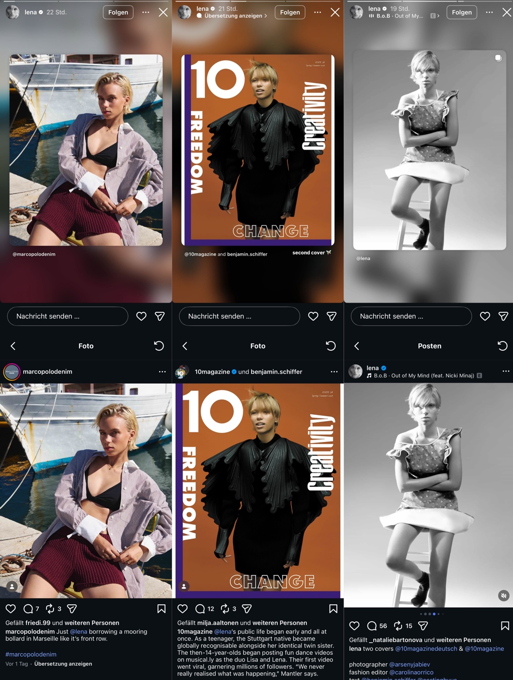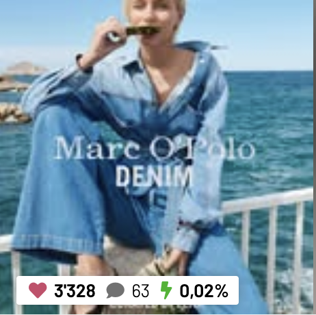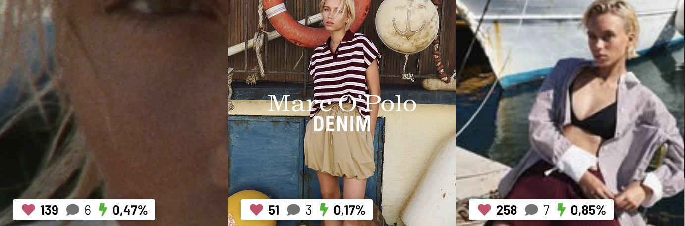 Das am Montag von Lena geteilte Posting, ihrer anderen in der Bio verlinkten Modelagentur The Face Paris, akquiriert nach 7 Tagen online knapp 250 Likes und 3 Kommentare. Sektkorken werden knallen! Das in ihrer Story geteilte Marc O´Polo Posting von Donnerstag erreicht nach 3 Tagen zumindest 200 (ausgeblendete) Likes und wahnsinnige 8 Kommentare (seit Mittwoch keinen einzigen mehr!) an Engagement, … ok, 4 davon vom Account der Marke selbst. LOL!