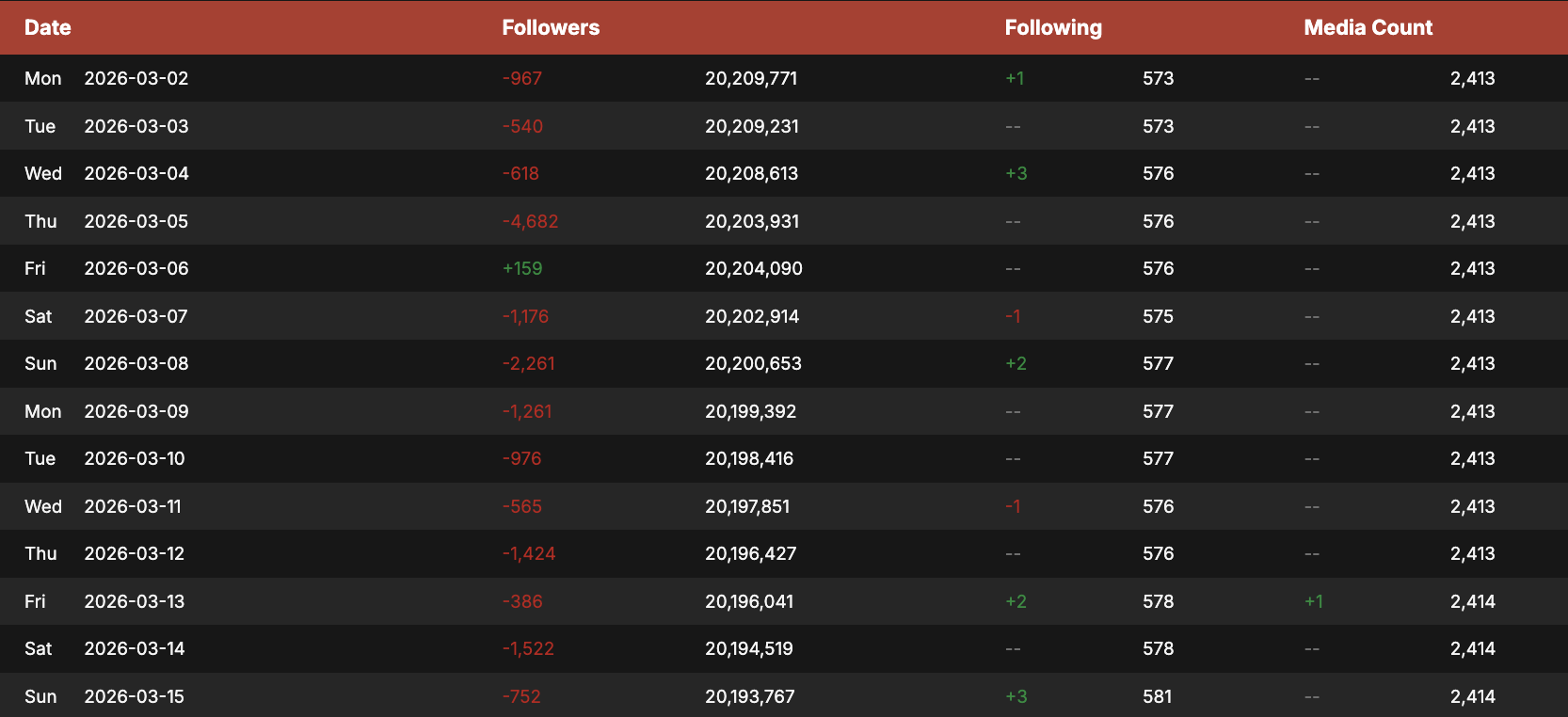 In der Nacht zum Montag hat unsere Lena die 20.1-Millionen-Grenze unterschritten und damit in den letzten 3 Monaten erfolgreich 100.000 Bots Follower vergrault. Bald feiern wir, das zweite Mal, die 20 Millionen „Fans“. Sonst passiert nix!