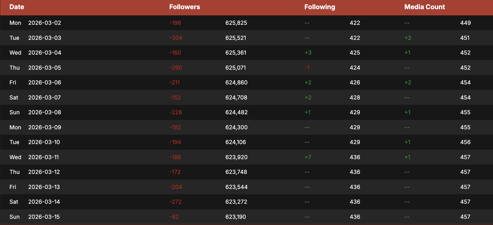 Joa, bleibt schlussendlich noch die Wochenbilanz: Lisa verliert über 1400 Follower und unser dauerabwesendes Elite-Model über 8000 Follower. Man beachte bei ihr den kleinen Follower-Schub aus dem Nichts vom Freitag, als ihre Bot-Armee versucht hatte die 4600 Verluste vom Vortag entgegenzusteuern (Quelle: Socialblade). Bis nächste Woche dann …