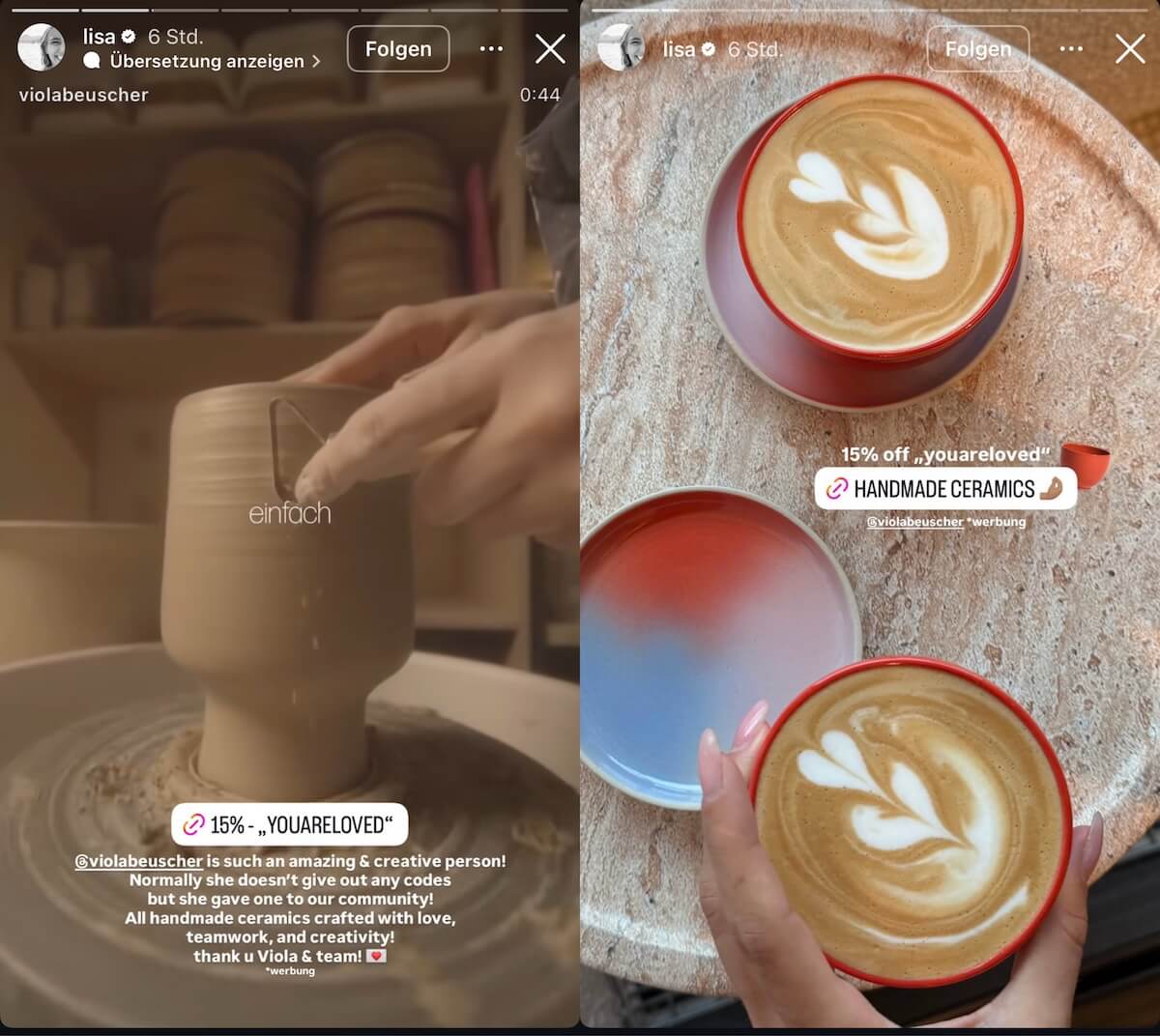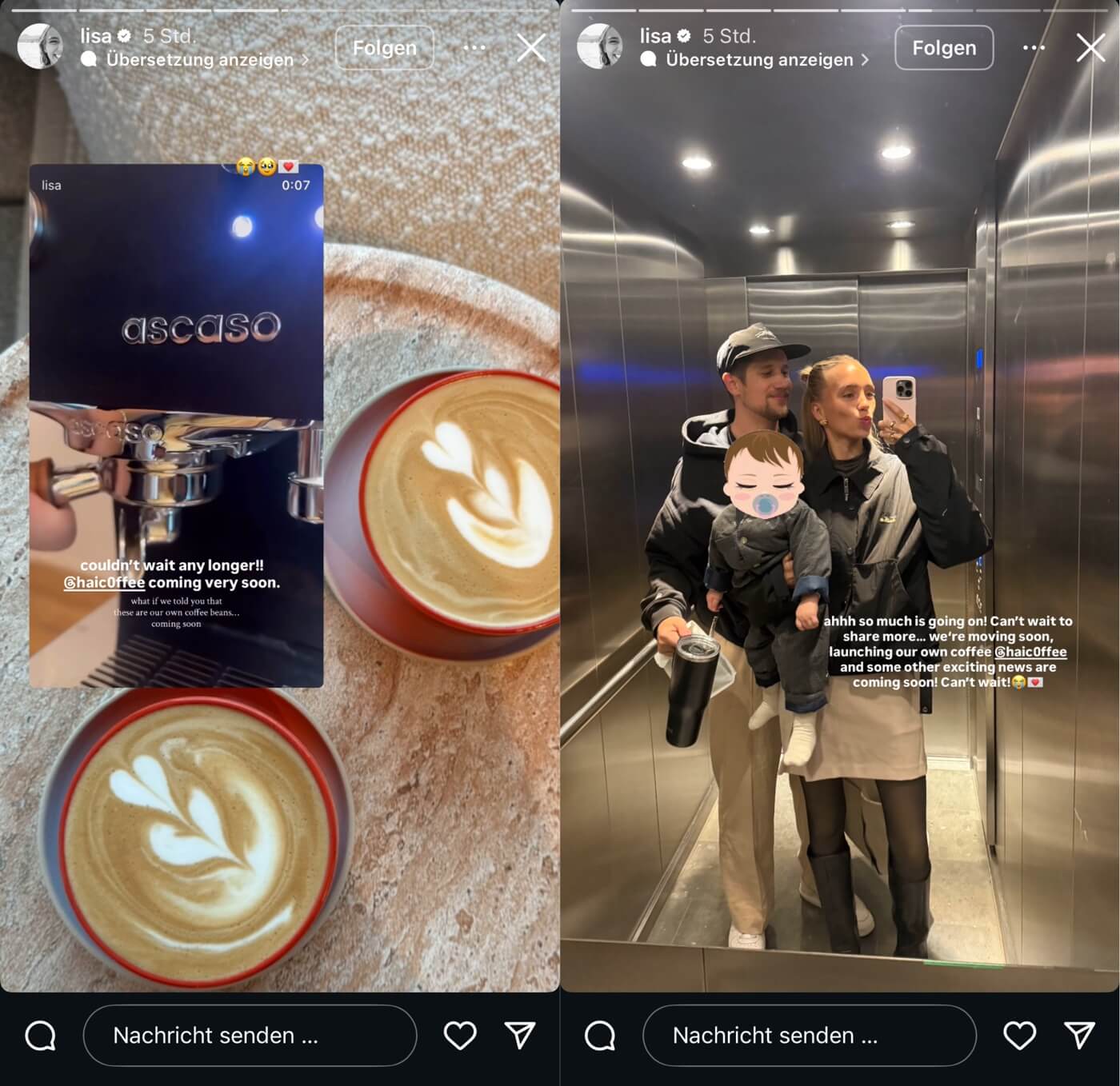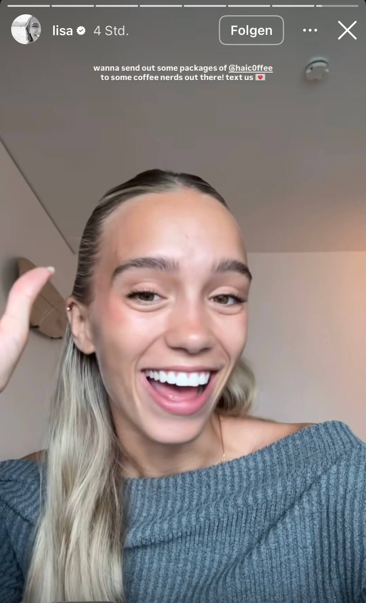 Noch zwei Storys mit Verlinkung ihrer neuen Marke und keine Werbekennzeichnung weit und breit. Dazu passend nochmal gleich 2 mal der Rabattcode für die Keramikbecher-Kooperation („youareloved„, weil sie uns so dolle mag) und natürlich die obligatorische gesponserte Kaffeemaschine wird auch gezeigt, zusätzlich dann alles in ein Collab-Reel platziert – das erste auf dem nunmehr 3. Account von Lisa, namens „haicOffee“. Keine Ahnung wie die Beiden auf die Idee kommen, dass sie ihrer selbsterschaffenen Fake-Bubble irgendwas verkaufen könnten!? Kein Fan hat jemals auf ihre zahllosen Bewerbungen hin, mal irgendwas diesbezüglich gepostet! Kaffee ist aktuell so teuer wie nie, warum sollte man gerade ihren also kaufen?! Und wer, vor allem?! Lisa hat diese Woche – die erst 2 Tage alt ist – auch schon wieder über 500 Follower verloren. Genauso wie jeden Tag Verluste, über 7000 Follower im letzten Monat! Mal sehn, wie ihr Business so aufgebaut ist, vermutlich wie bei ihrer Schwester, nur mit einem gutgläubigen Investorenkonstrukt.