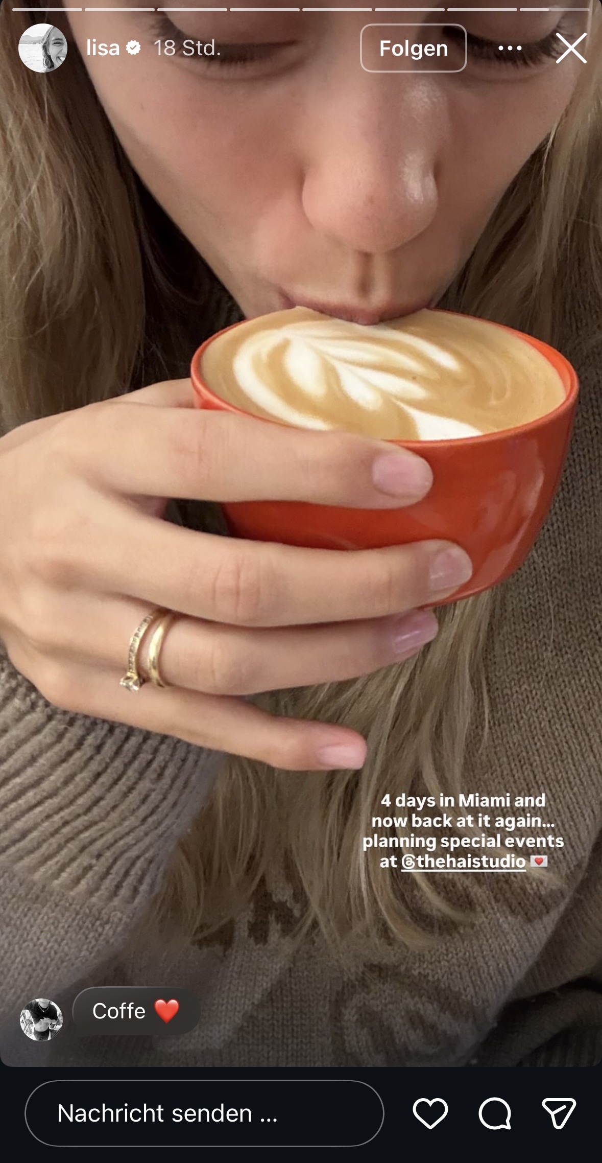 Da niemand anders offenbar Lisa´s teure Kaffeebohnen kauft, muss am Freitag wieder eine ihrer Freundinnen für ihre alltäglich-perfide Schleichwerbungsshow herhalten. Ganz eigenverantwortlich und üüüberhaupt nicht inszeniert hat sie ein Reel (mit Verlinkung! und ohne Werbekennzeichnung) gepostet – ausführlich wird es nun in Lisa´s Story untergebracht. Werbekennzeichnung fehlt auch hier! Für diese billige Show gönnt sich Lisa heute nochmals 400 neue Follower … ihr wisst schon, von DEM einem Posting von vor 7 Tagen, kommen mittlerweile über 20.000 Follower scharenweise zu ihr. LOL! Interagiert nur halt keiner von denen …