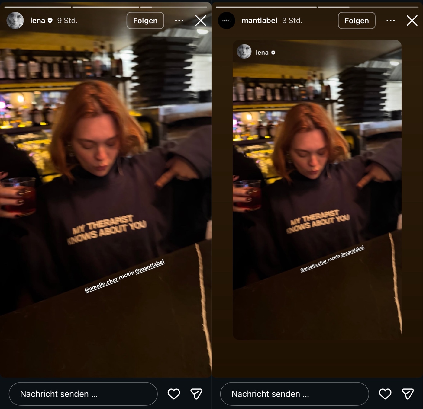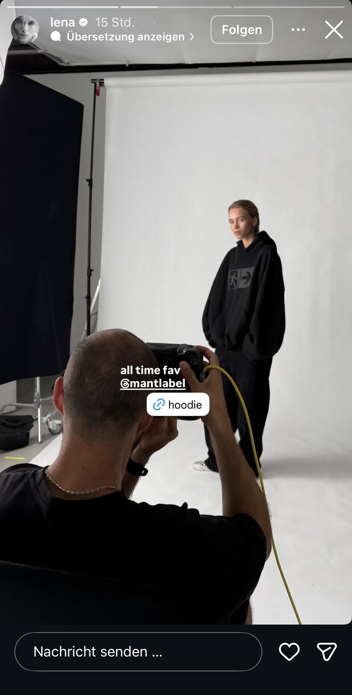 Dienstag! Lena weiter im Doppel-Schleichwerbungsmodus. Neues Posting wird auf dem Account ihrer Marke mant hochgeladen … Lena teilt alle Einzelbilder in ihre Story. Dann ist ein Typ zu sehen und verlinkt, der wohl bei ihr zu Besuch ist. Keine Ahnung wer er ist, es gibt keinerlei Kontakt oder Konversation dazu … aaaaber er hat ein Hoodie an … von Lenas Marke! Nächste Story wird der Hoodie verlinkt. LOL! Alles wird bei der Marke geteilt! Kennzeichnungsverletzung on point – so geht Lena-Business. 1600 Follower minus today …