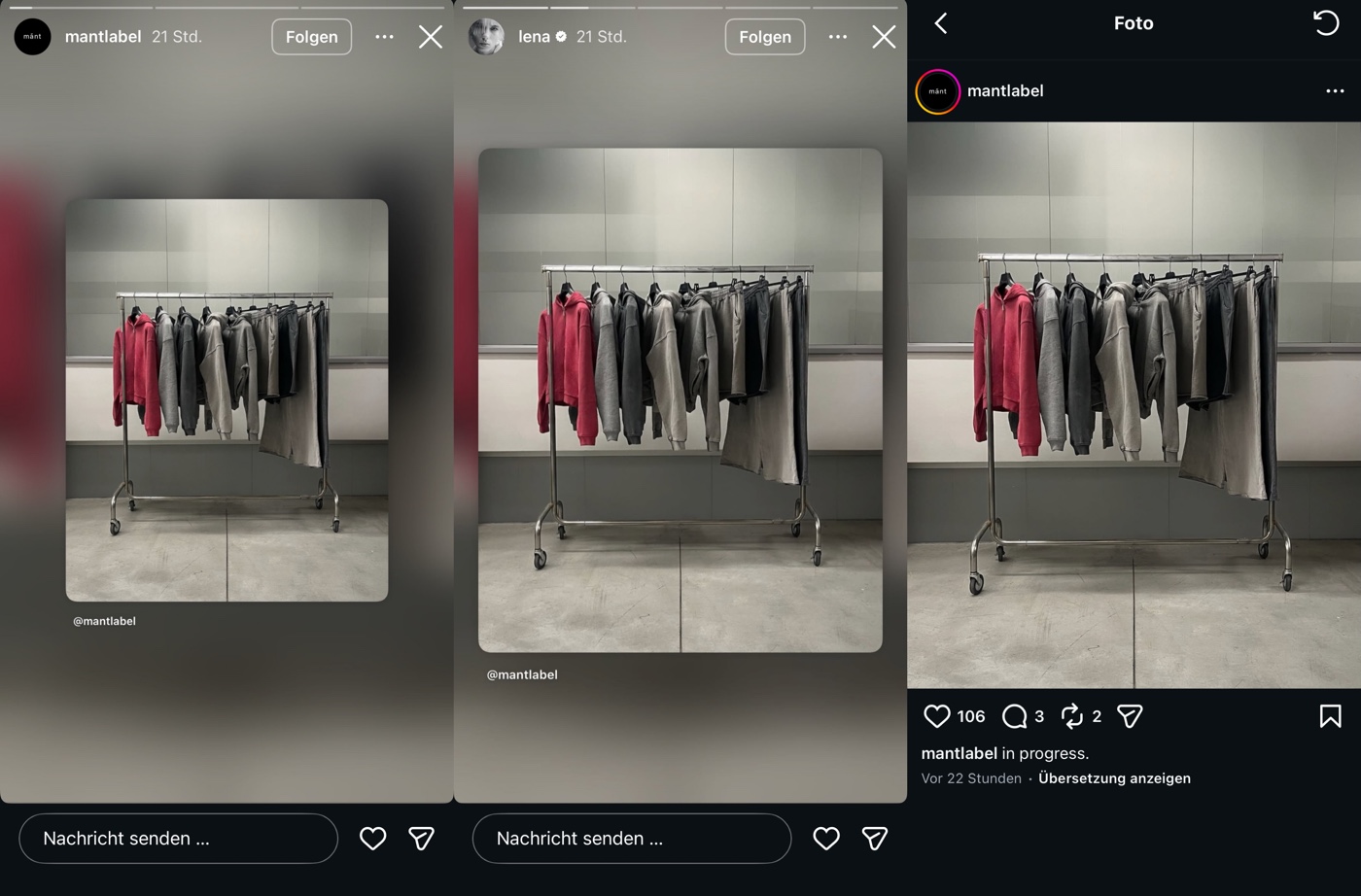 Nach dem „Re-Launch“ letzte Woche hier mal die Zusammenfassung der bisherigen (neuen) Beiträge bei „Lena´s“ Modemarke. Auf den letzten Posts hatte „mantlabel“ insgesamt 1’102 Interaktionen. Pro Posting sind das durchschnittlich 92 Interaktionen (Kommentare und Likes). ALLE waren bei Lena in der 20-Million-Story für jeweils 24 Stunden geteilt! Ungeniert geht es heute weiter … Lena zeigt und verlinkt ihre Marke, die Marke repostet – keinerlei Werbekennzeichnung! Unser Flopp-Superstar ist unterwegs nach Miami und irgendein Ahnungsloser wird es wieder (be)zahlen!