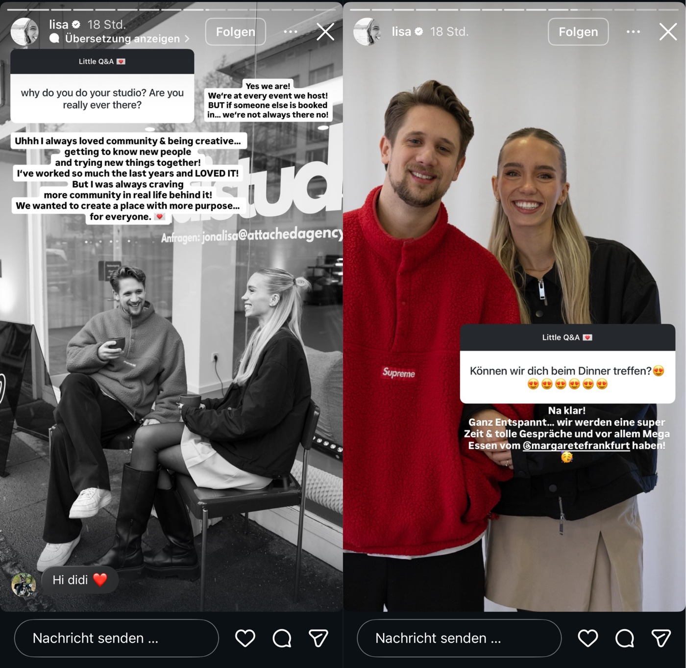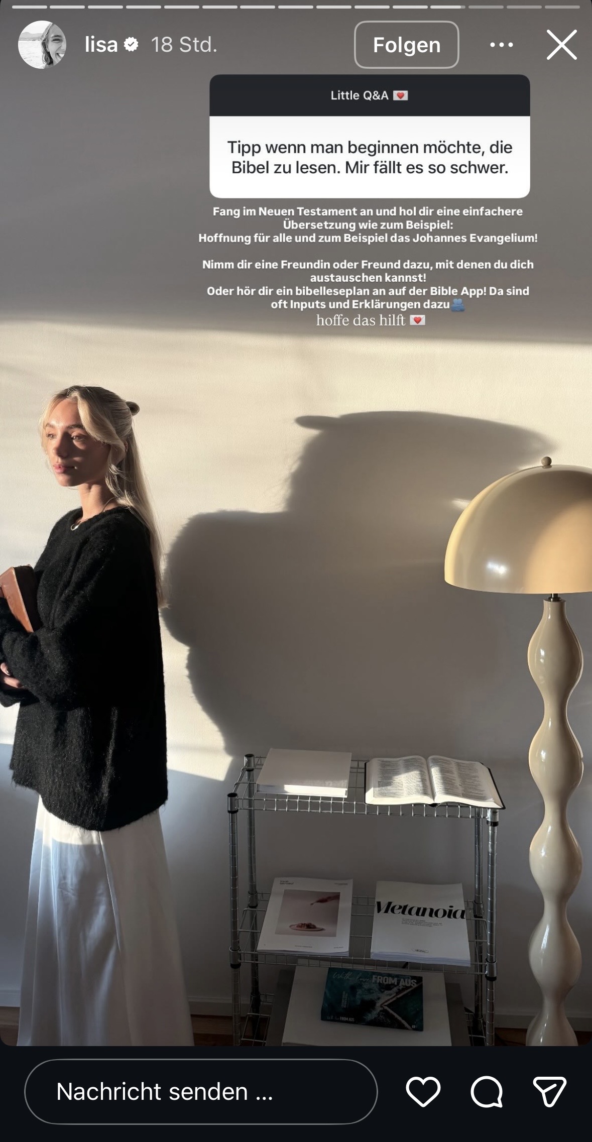 Richtig skurril wird es dann aber direkt beim nächsten Thema. Ganz in klassischer Lisa-Manier wird heute ein dekorativer Blumenstrauß in einer – mit Sicherheit völlig uneigennützig platzierten – Keramikvase in Szene gesetzt. Erst prominent alleine in der Ecke stehend, dann im neuen Feed-Post drapiert, danach selbstverständlich auch noch in der darauffolgenden Story – in der sie das gute Stück die ganze Zeit grinsend in den Händen hält. LOL! Als Aufhänger dieser öden Schleichwerbung diente (mal wieder) ein Fragesticker. Bibel und Baba sind als Fragen dabei … geantwortet wird stilecht in der gesponserten Wohnumgebung … wobei eine (vermeintlich sogar echte) Frage dann doch nicht beantwortet wird, weil „so many questions, but laying my phone away now!„. Schade, hätte man sie mal sprechen hören können, ohne Werbung für irgendwas zu machen. Nun ja, Zeit hat sie dann aber plötzlich doch noch gehabt … denn natürlich fragt – rein zufällig, versteht sich – noch jemand nach ihrem Business und DEM Event der Woche. LOL! Perfekte Gelegenheit hier für Lisa, um abschließend noch zweimal Schleichwerbung mit Verlinkung subtil unterzubringen.