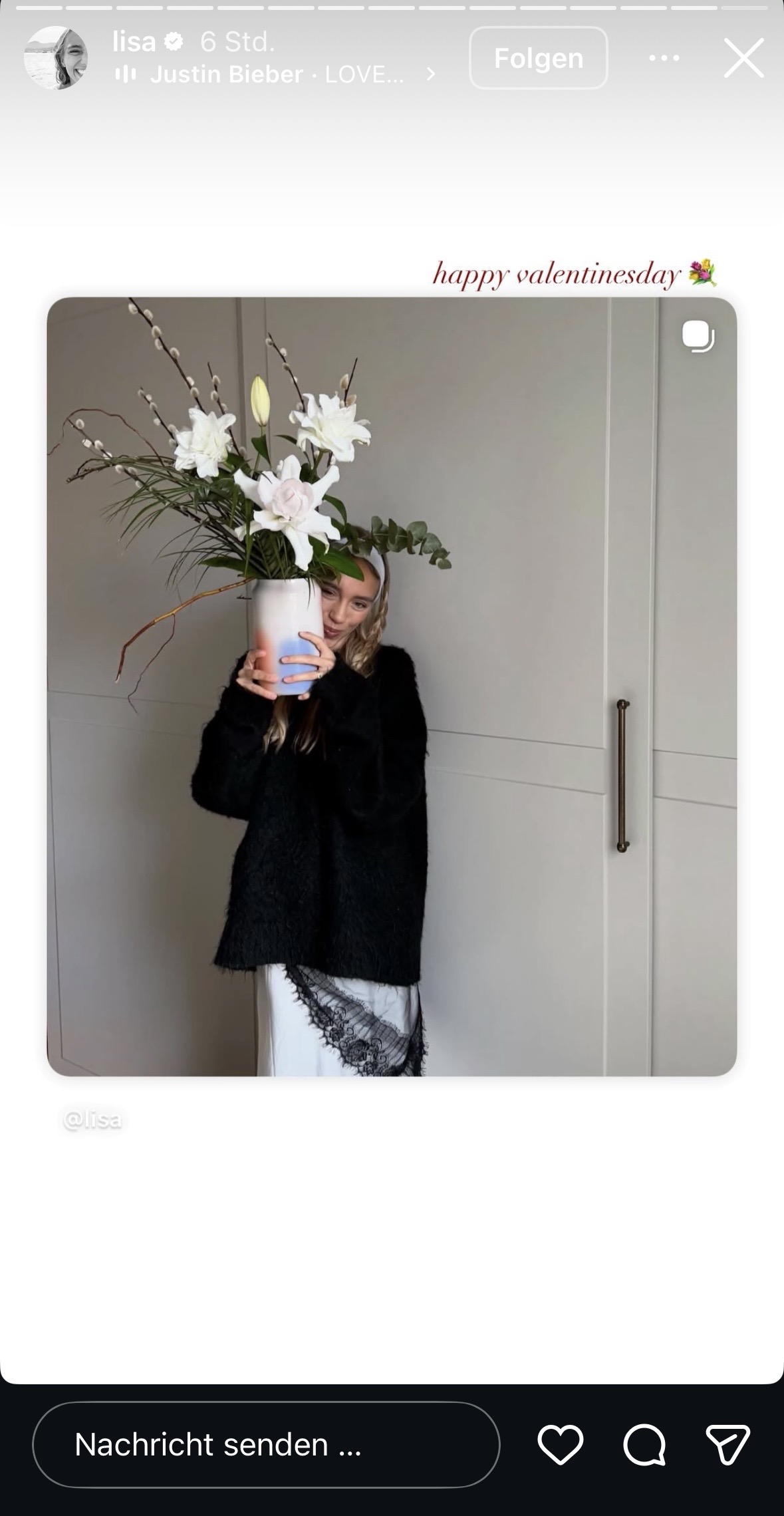 Am Samstag ist Valentinstag. Wie schön, kann man wieder was bewerben! Lisa teilt da direkt nochmal ihre neue (gesponserte) Lieblingsblumenvase in die Story – das reicht ihr heute an Konversation. Wie dämlich das ganze Blumenvasen-Theater eigentlich von außen wirkt, ist ihr offenbar völlig gleichgültig!