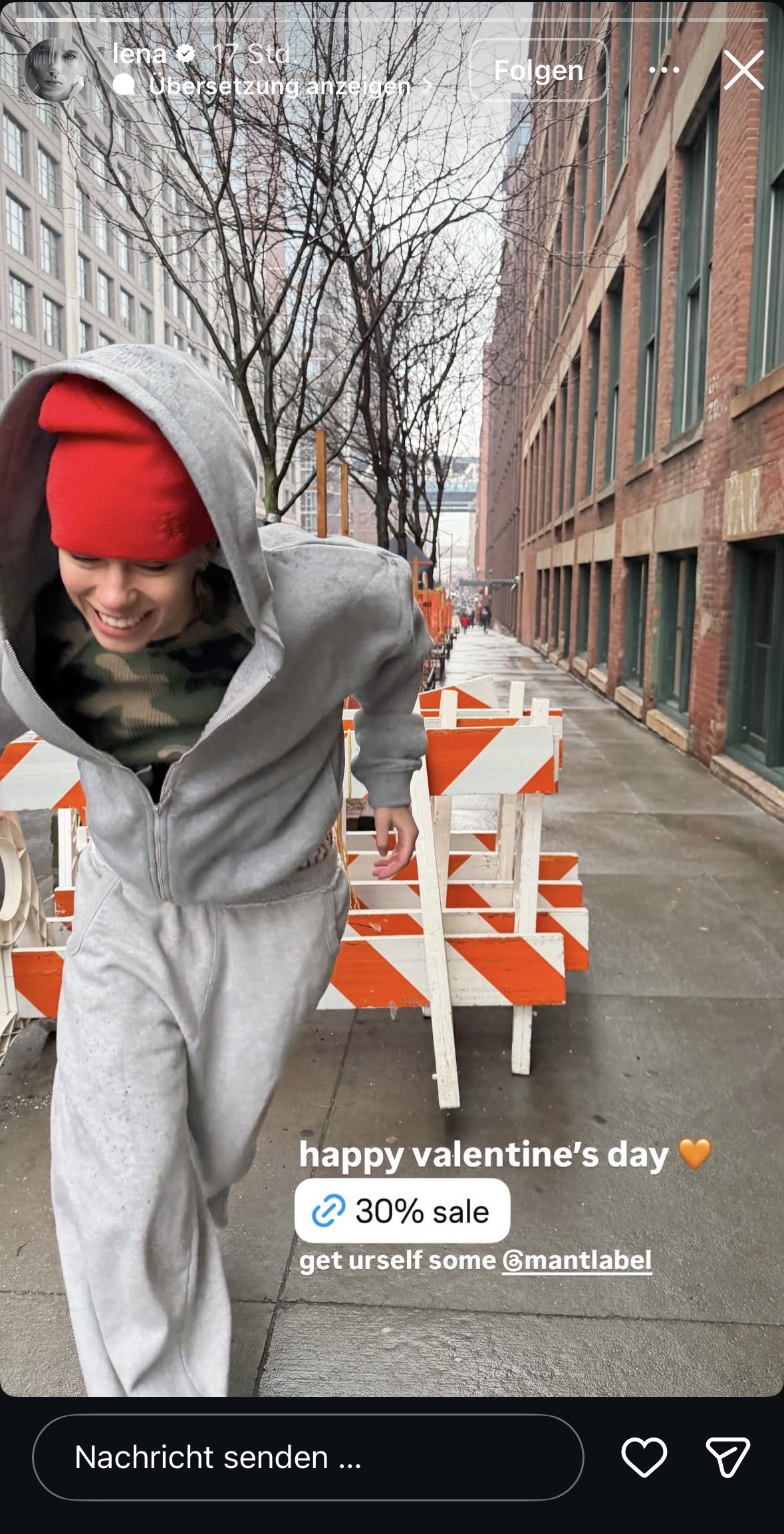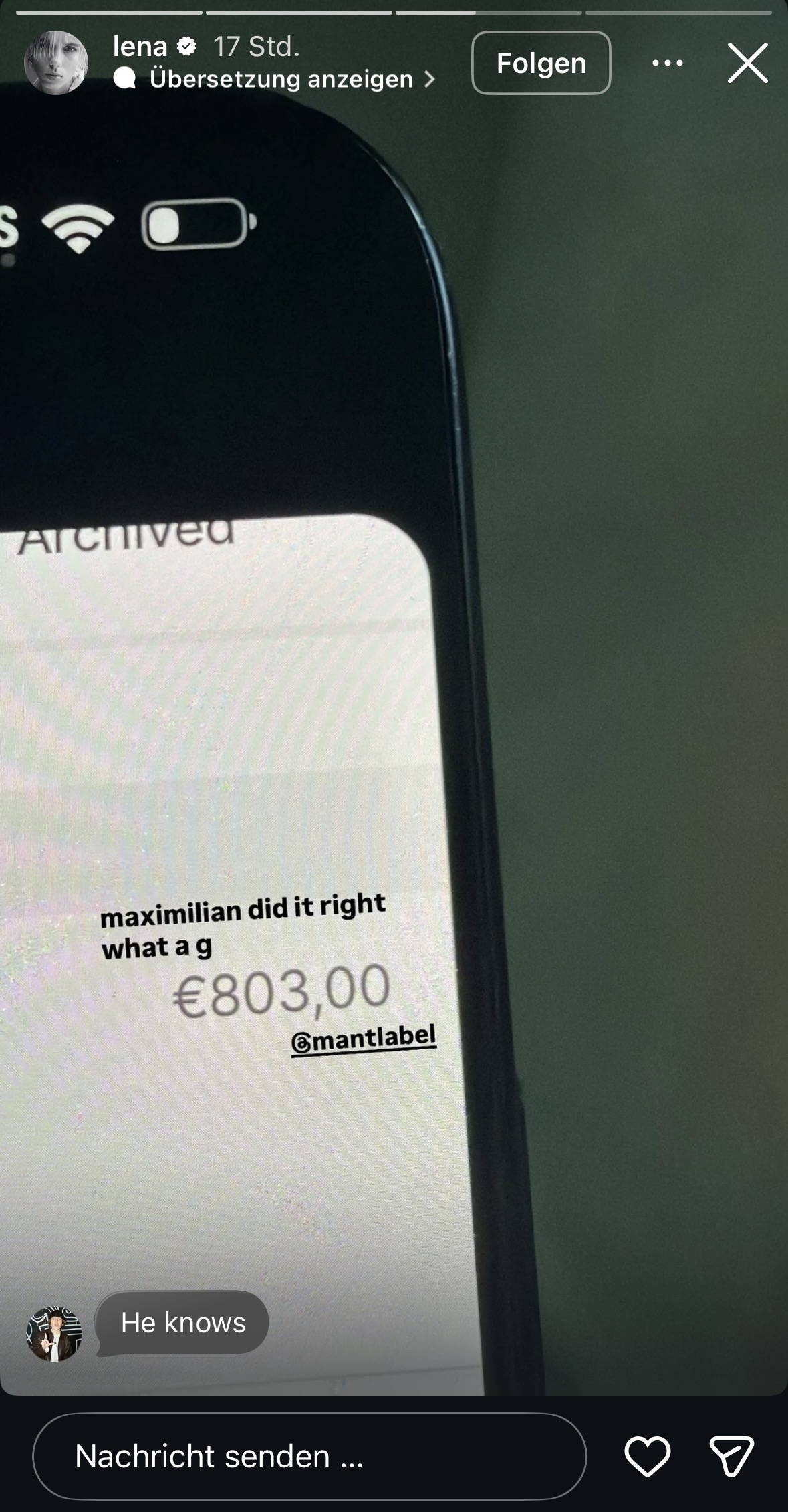 Lena! Auch da, … und sie macht das, was sie am besten kann. In Klamotten ihrer Marke schreitet sie durch New York. In den heutigen stummen Stillleben werden wieder Produkt und Marke verlinkt – die das Meisterwerk an einfallsreichen Content selbstredend auch sofort teilt. Der Oberknaller kommt aber noch! Lena präsentiert als Nächstes ein (schlecht bearbeitetes) Foto mit einer angeblichen Bestellung von 800 Euro, von einem „Maximilian“. Soso! Keinerlei Werbemarkierung auch heute!