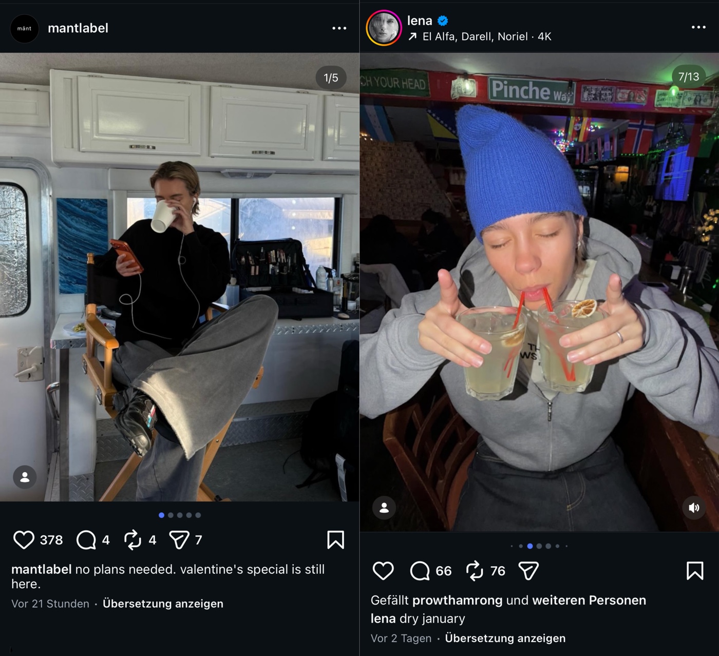 Lena droppt ein neues Posting auf dem Account ihrer Marke und teilt es stumm in ihre Story – die Marke repostet es: Schleichwerbung perfekt! Weiter geht es mit einem neuen Posting („dry january“, reicht als allumfassende Caption) auf ihrem Account – zusammengefasst zu sehen natürlich wieder nur selbstdarstellerische Bilder, die wir schon in den letzten Wochen gesehen hatten und offenbar Lena´s neuen Lifestyle repräsentieren sollen: Party, Alkoholkonsum, ihre Mädels und – ganz wichtig – jede Menge Schleichwerbung-Klamotten-Placements. Den Abschluss macht eine weitere stumme Schleichwerbung, mit Produktverlinkung … zum Valentinstag!