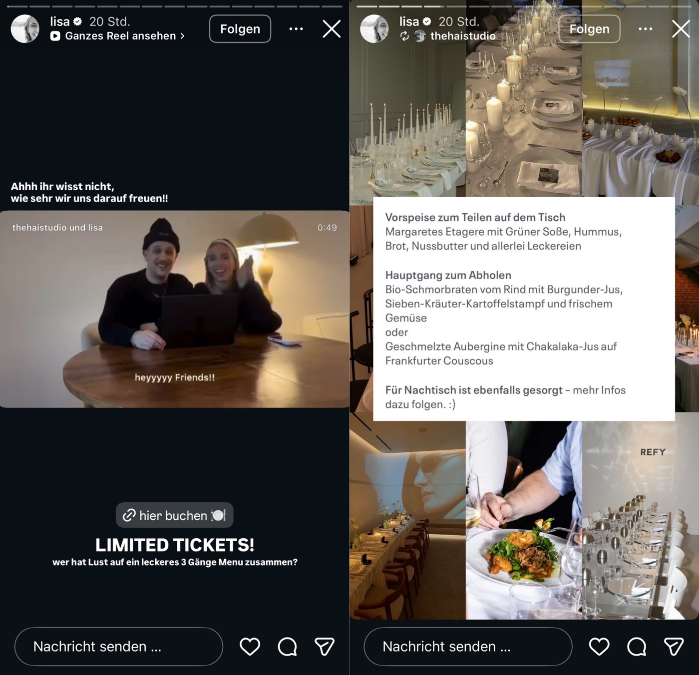 Aber Lisa ist das egal, es geht stur weiter im Programm. Heute wird zuerst zum o.g. Flop-Event ein neues Collab-Reel gedropped, wo beide grinsend vor die Kamera treten, um auch noch mal persönlich für das Event zu werben. Die Verlinkung in Lisa´s Story trägt selbstredend natürlich auch wieder keine Werbemarkierung!