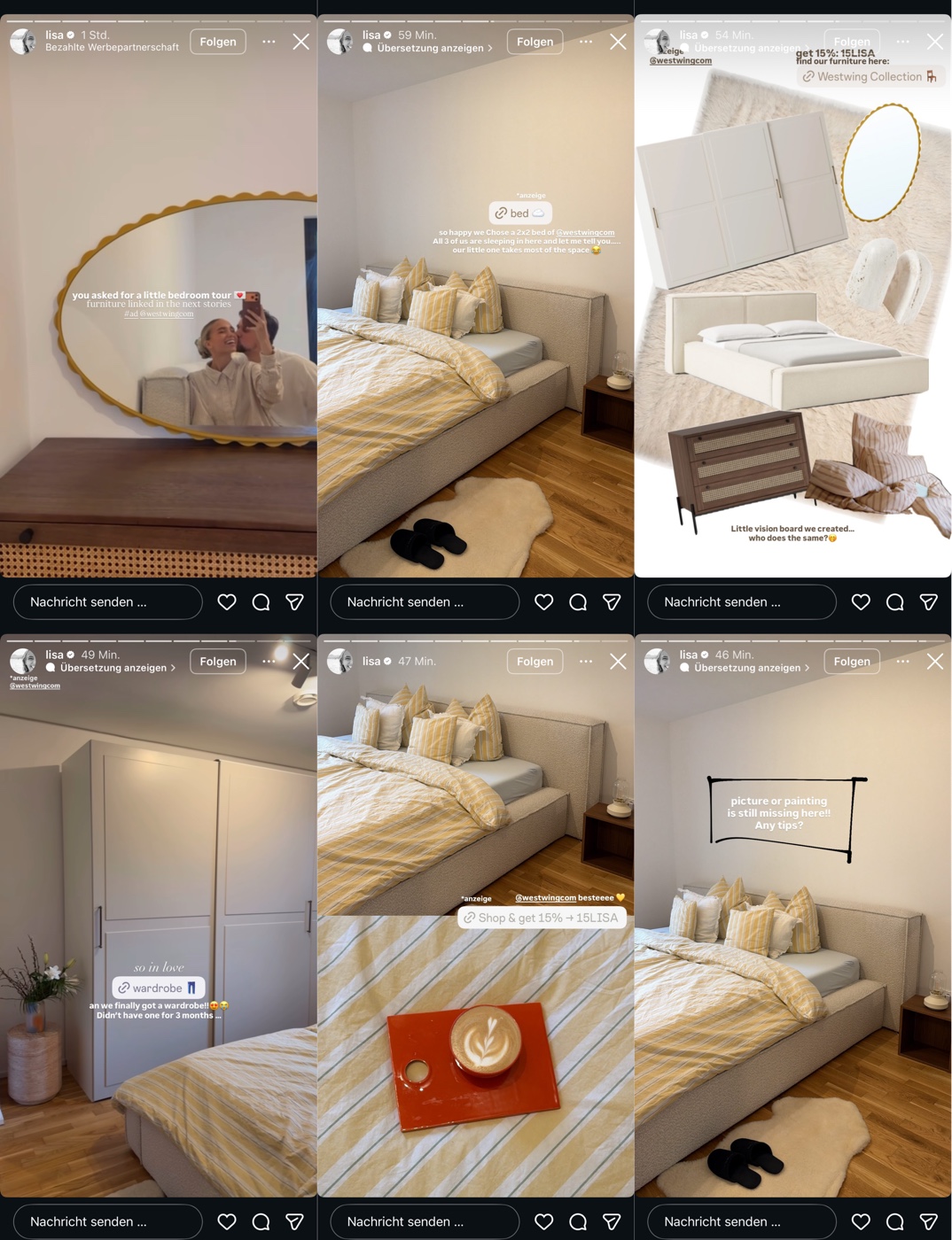 In 6 aufeinanderfolgenden Storys werden heute Bett (1400 Euro) und Schränke (4000 Euro) beworben … ein Bild über dem Bett fehlt noch – kommt aber sicher bald nach! Auch hier bedarf es keinerlei Worte (kosten bestimmt extra!?) … mit den stummen Storys und einem Rabattcode (den keiner nutzen wird) ist das Schlafgemach bezahlt! Auf gehts, dann zum nächsten Raum … wer will zahlen!?