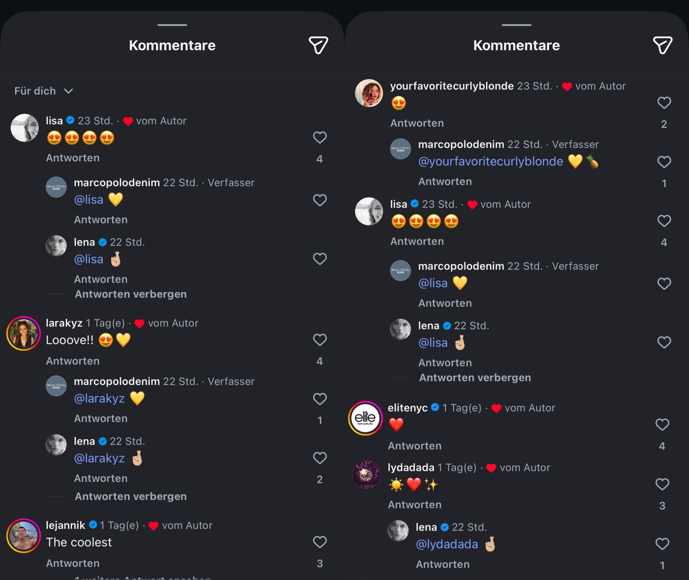Bei Lena selber läuft ebenfalls (wieder) nix, auch wenn 120 Kommentare erstmal – für Lena Verhältnisse – gut aussehen. Schaut man aber wieder genauer hin und zählt mal zusammen, stammen locker über die Hälfte davon von Lena selbst, die jeden Kommentar mit Emojis beantwortet und auch wieder mit dabei Lisa, ihrer Agentur, deren Mitarbeitern und ihre Freunde.