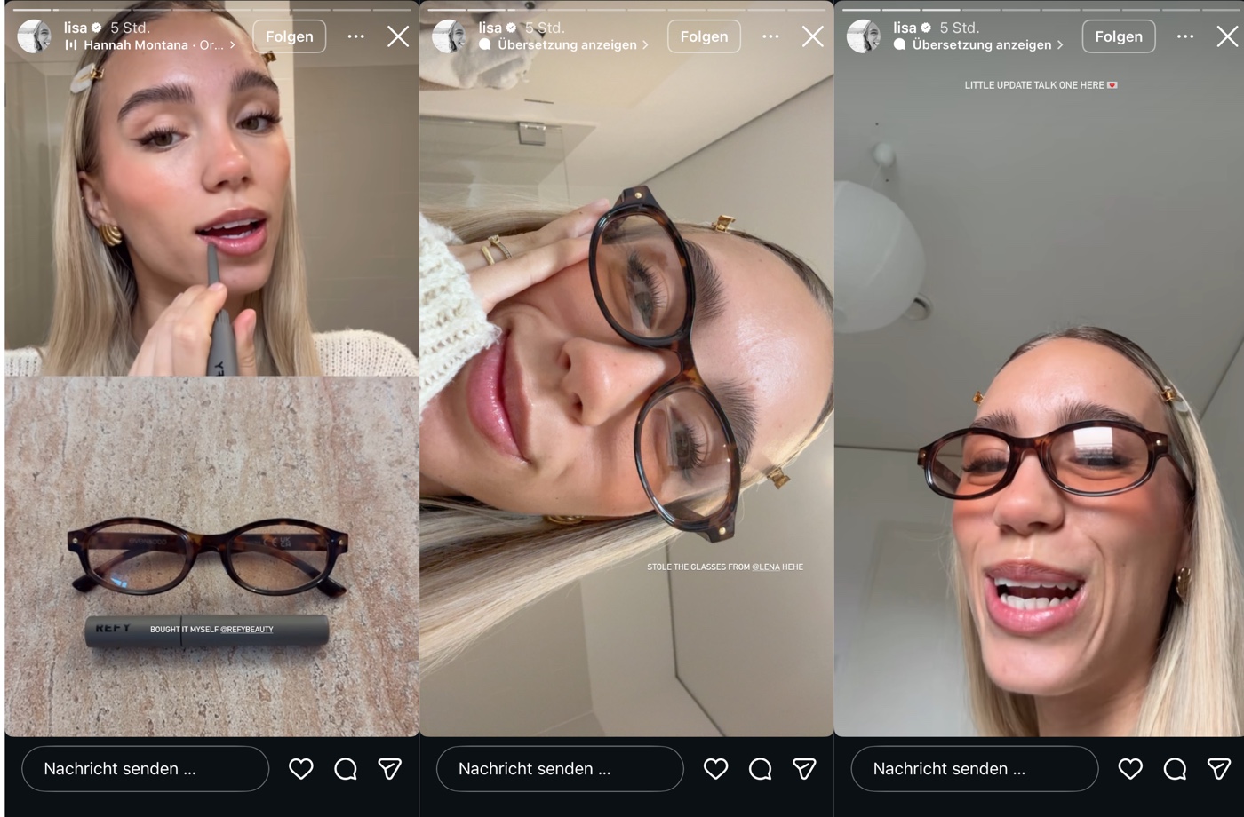 Mittwoch! Lisa is back und tritt grinsend vor die Kamera. Ihr wisst direkt, was es bedeutet … genau, neue Werbung ist am Start! Heute geht es (hatten wir lange nicht) um Brillen … LOL! Jaaa, Lisa und ihre alberne Brillen-Schleichwerbung kennen wir schon aus der Vergangenheit – aber diesmal wirft ein anderer Glücklicher, nämlich REFY Beauty, Marketing-Kohle für eine Lisa aus dem Fenster. Sie ballert auch brav mehrere Storys raus und gibt sich alle Mühe, diesen Schwachsinn halbwegs glaubwürdig rüberzubringen (wirkt aber absolut lächerlich). Damit wisst ihr übrigens auch, wo das platzierte MakeUp heute und demnächst herkommt!? Richtig, auch vom Brillen-Gönner!