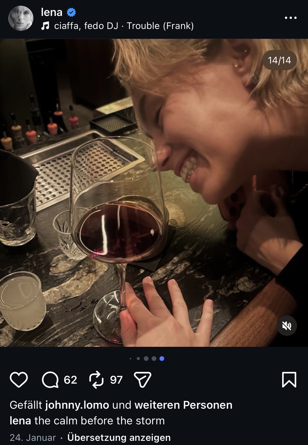 Bei Lena wird kein Wort verloren, als nötig. Heute gab es nur wieder unmarkierte Werbung für „ihre“ Marke zu sehen, danach (nach dem anstrengenden Tag) ein Stillleben aus einer Bar. Ist Lena ja neuerdings öfter mal … in so Bars und so. Dann Prost!