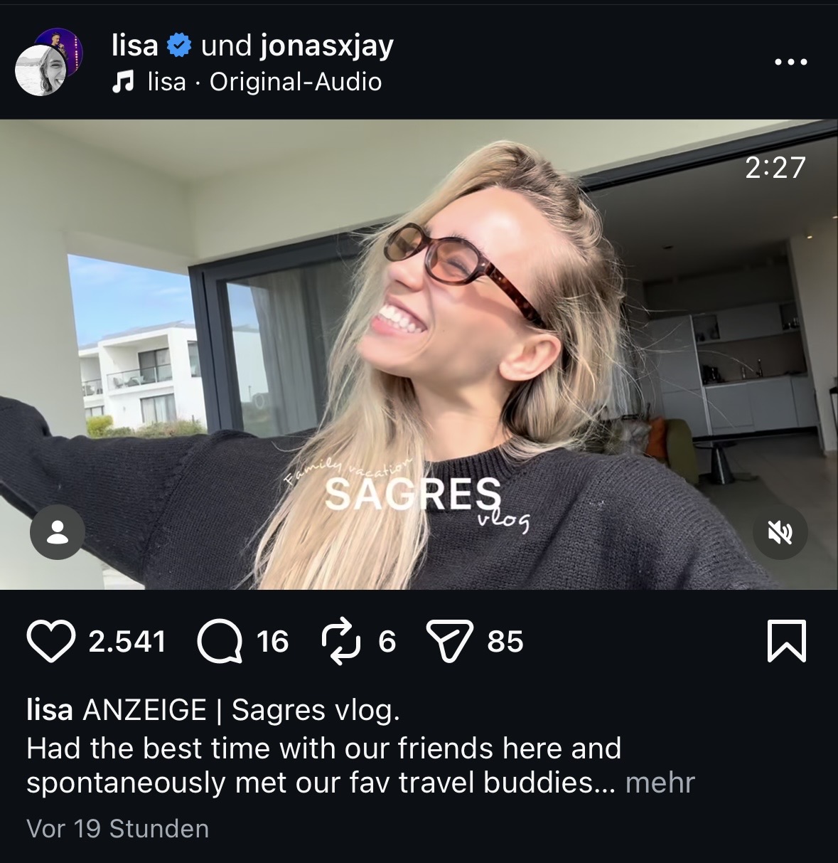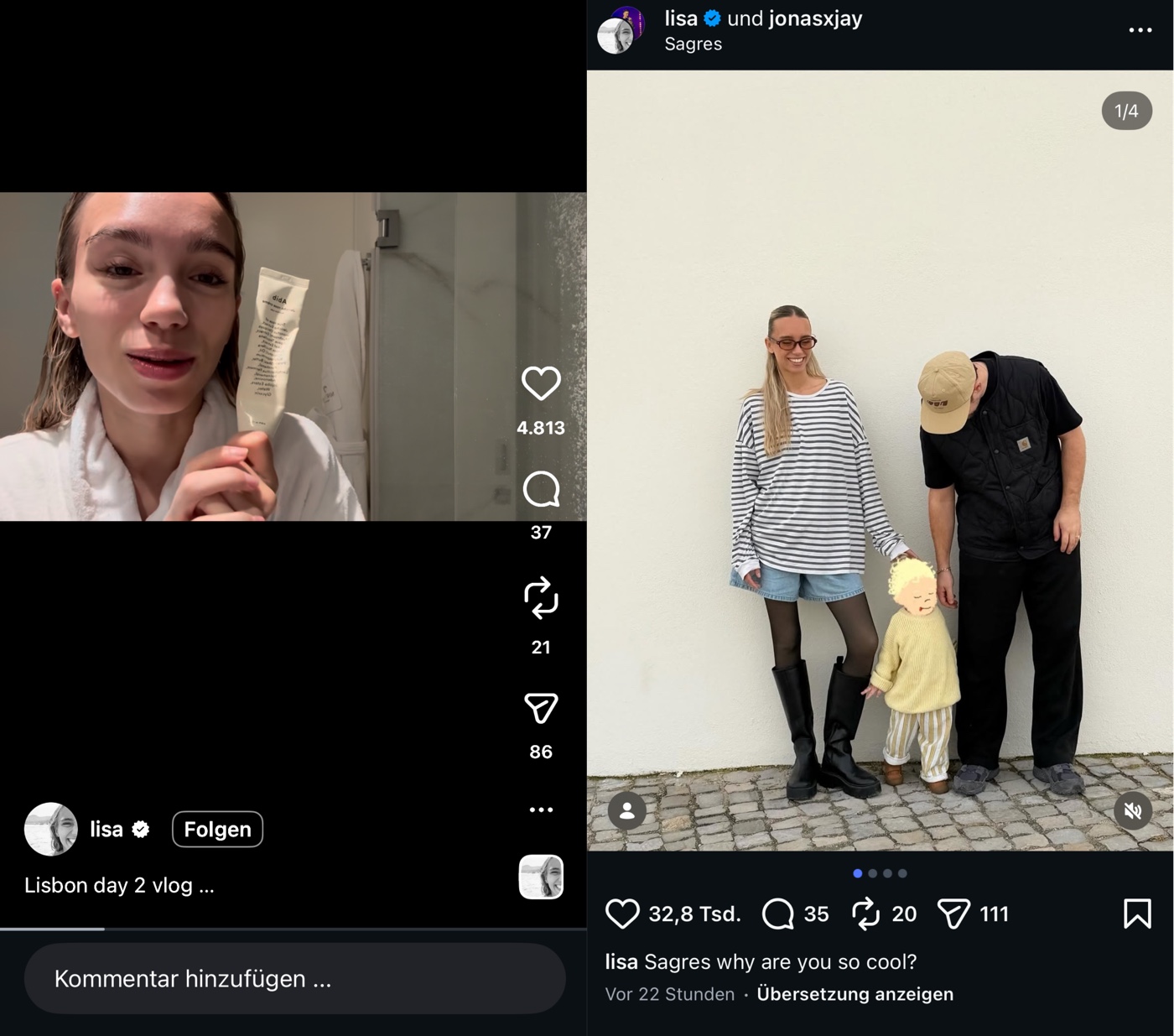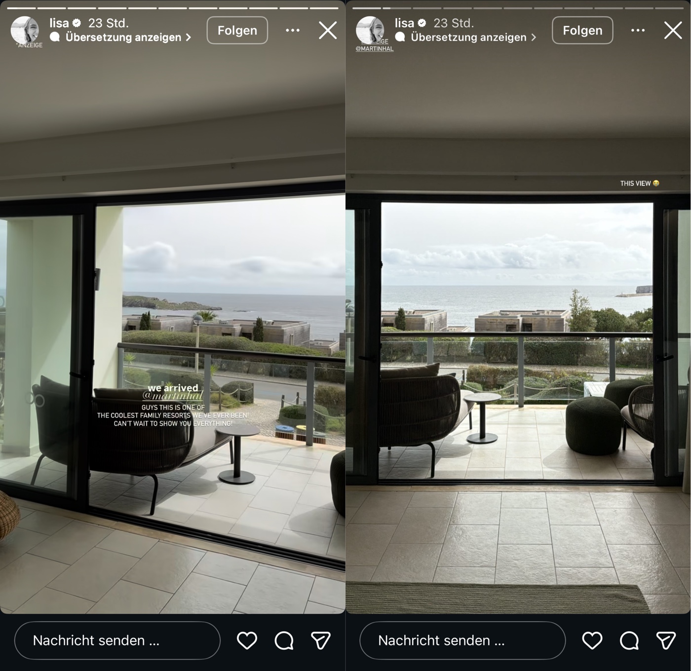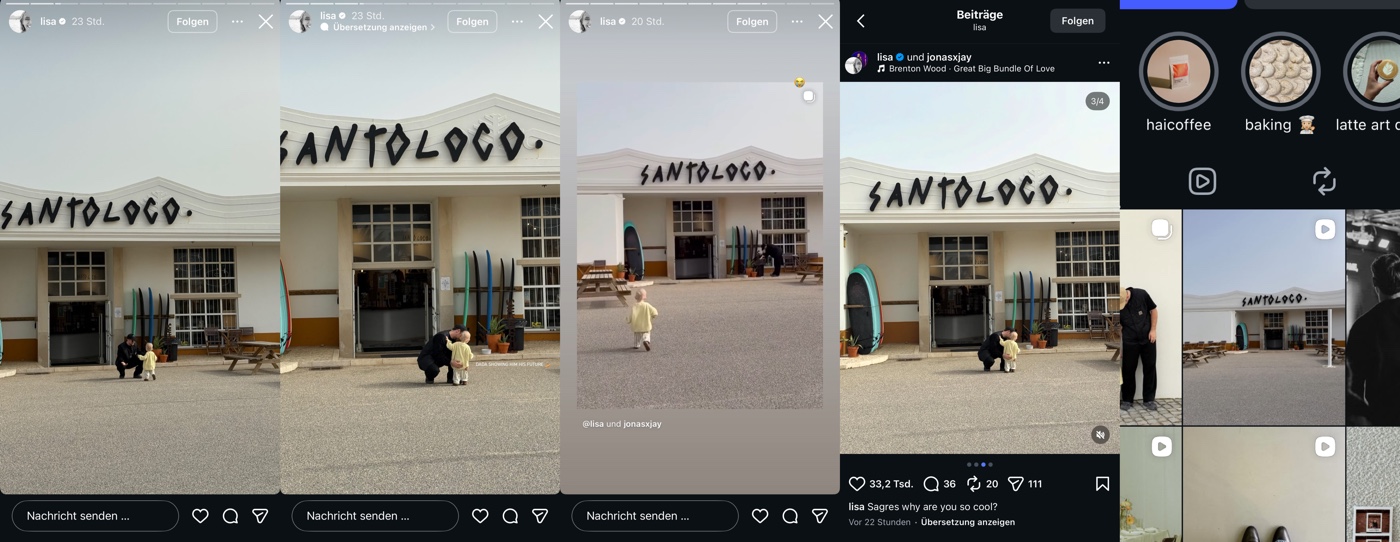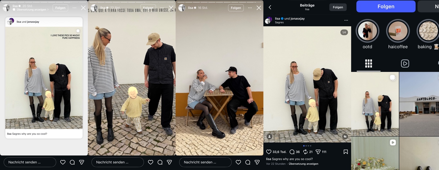 Am Montag meldet sie sich also wieder aus Lissabon (Portugal) aus dem mondänen Martinhal Hotel (250 €/Nacht) … jaaa,und fährt das übliche Standardprogramm auf: Familienidylle wird inszeniert, Zimmer-Storys werden gedroppt und mit blumigen Worten garniert … und das Reel von vor einem Jahr (mit aktiven „Lisa Effekt“) wird selbstverständlich auch nochmal ausgegraben und verlinkt. Man weiß direkt: Das geht jetzt ein paar Tage lang so weiter!