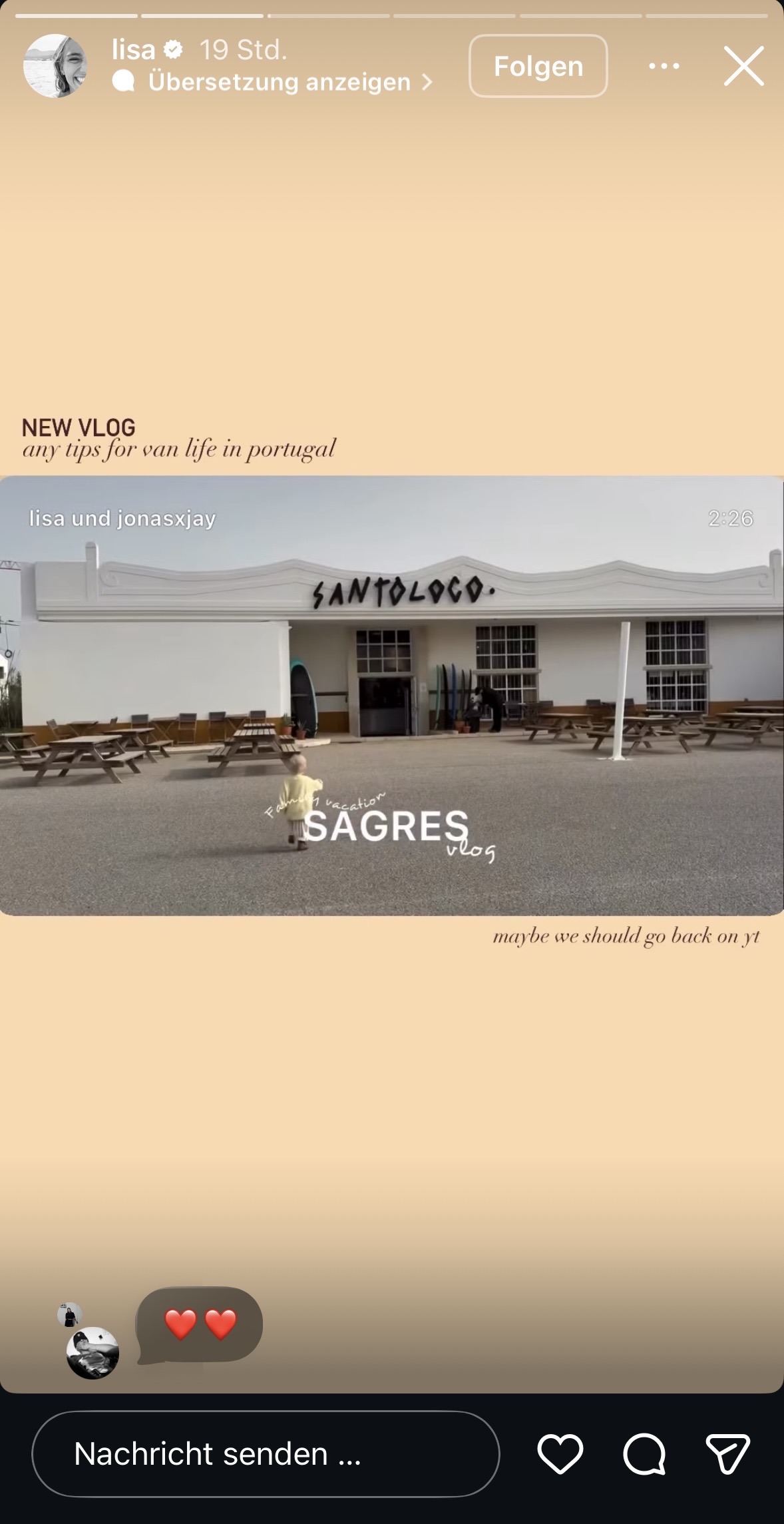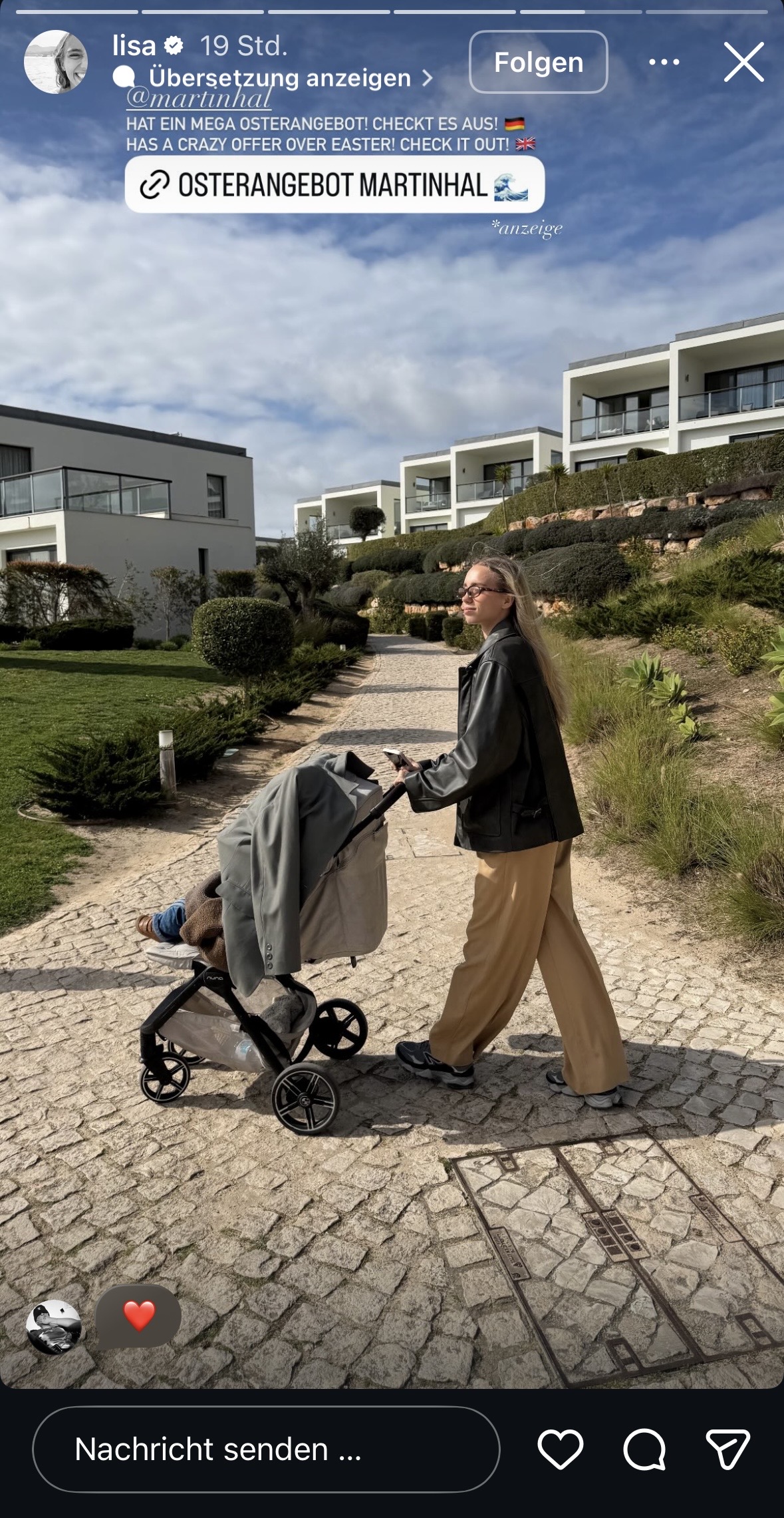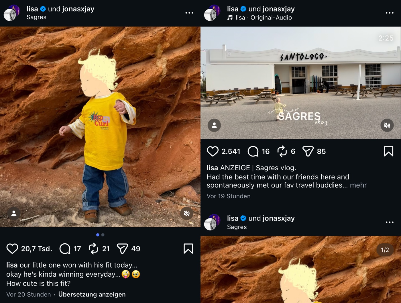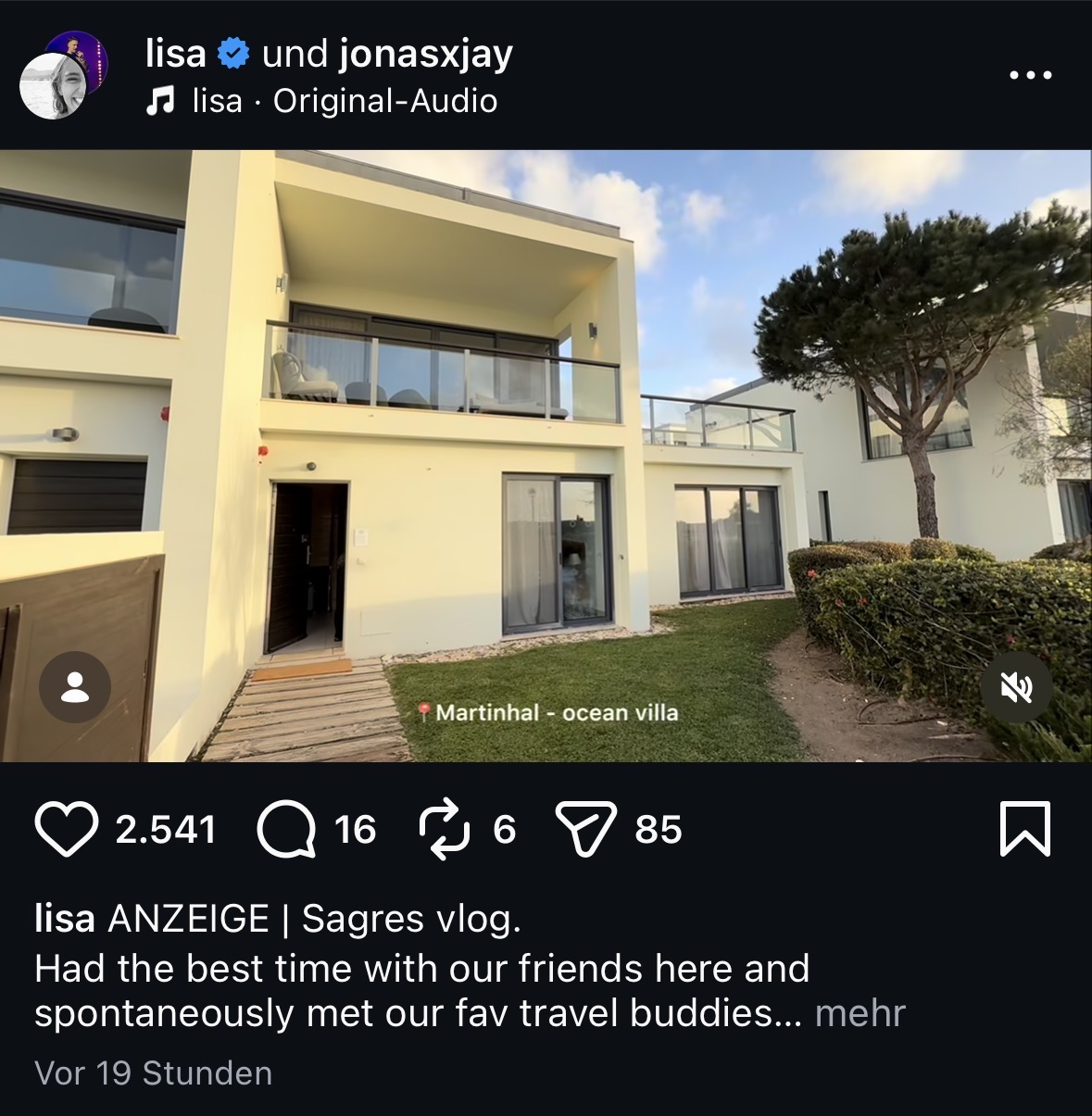 Am Montag meldet sie sich also wieder aus Lissabon (Portugal) aus dem mondänen Martinhal Hotel (250 €/Nacht) … jaaa,und fährt das übliche Standardprogramm auf: Familienidylle wird inszeniert, Zimmer-Storys werden gedroppt und mit blumigen Worten garniert … und das Reel von vor einem Jahr (mit aktiven „Lisa Effekt“) wird selbstverständlich auch nochmal ausgegraben und verlinkt. Man weiß direkt: Das geht jetzt ein paar Tage lang so weiter!