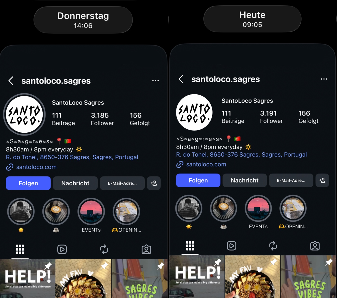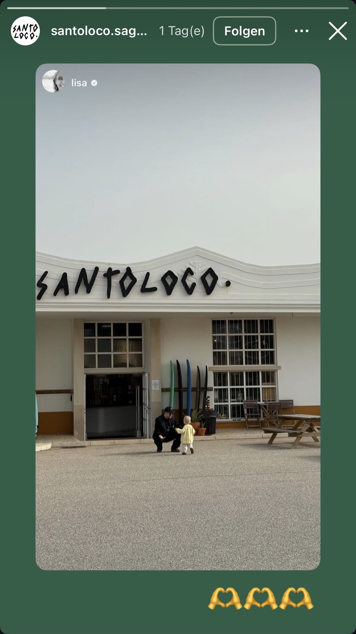 Am Mittwoch gibt es wieder 2x Hotelbewerbungen in der Story, gefolgt von nicht gekennzeichneter Werbung für ihr Vermietungsbuisness (Ein neues Event steht an!), zu guter Letzt werden mal wieder mit der ganzen Familie Klamotten schleichbeworben platziert … zuerst wie üblich im Großformat in der Story, dann als Feed-Collab mit Hubby und als Startbild. Das im Hintergrund zudem ein Klamottenladen (bzw. die Klamottenkette SantoLoco) permanent zu sehen ist („Dada showing him“ ihrem Kind „his future„) … während alle die neuen Klamotten präsentieren … und dieser Shop Lisa´s Postings teilen und kommentieren … und Lisa den Shop und Klamotten auch als Startbilder in den Feed platziert … ist alles sicher nur ein weiterer Zufall. Zweimal jetzt exakt derselbe Move in dieser Woche – Gaaaaanz sicher ist das ein Zufall! Minus 160 Follower heute …