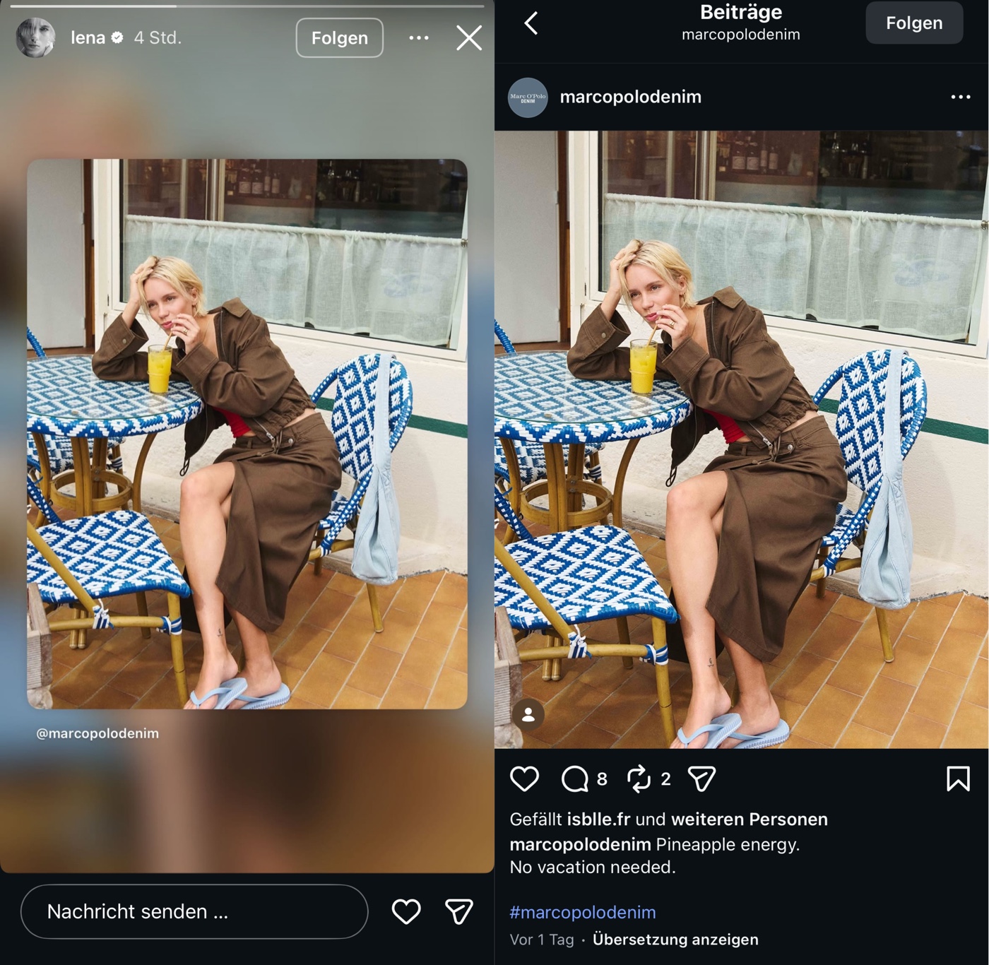 Toppen kann diesen Wahnsinn nur noch Supermodel Lena. Hauptsächlich abwesend tourt sie gesponsert durch die Welt. Nur wenn es nötiger weise was zu bewerben oder neue „Freunde“ in einer Bar zu beeindrucken gibt, taucht sie kurz auf – so auch heute! Stumm und kontextfrei teilt sie ein weiteres Foto vom Marc O´Polo Account in ihre Story. Ergebnis nach 24 Stunden Shoutout wieder bodenlos! 4 der 8 Kommentare stammen von der Marke selbst – Likes blenden sie mittlerweile aus … besser so!