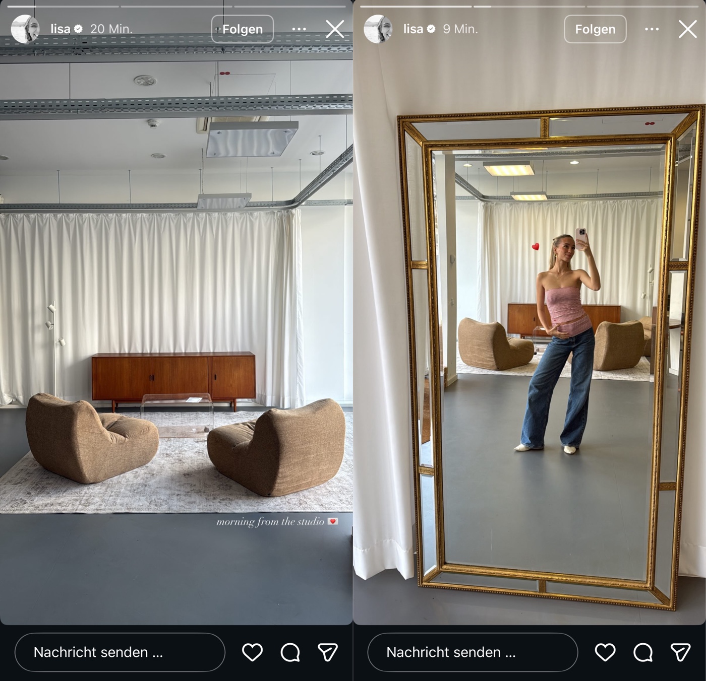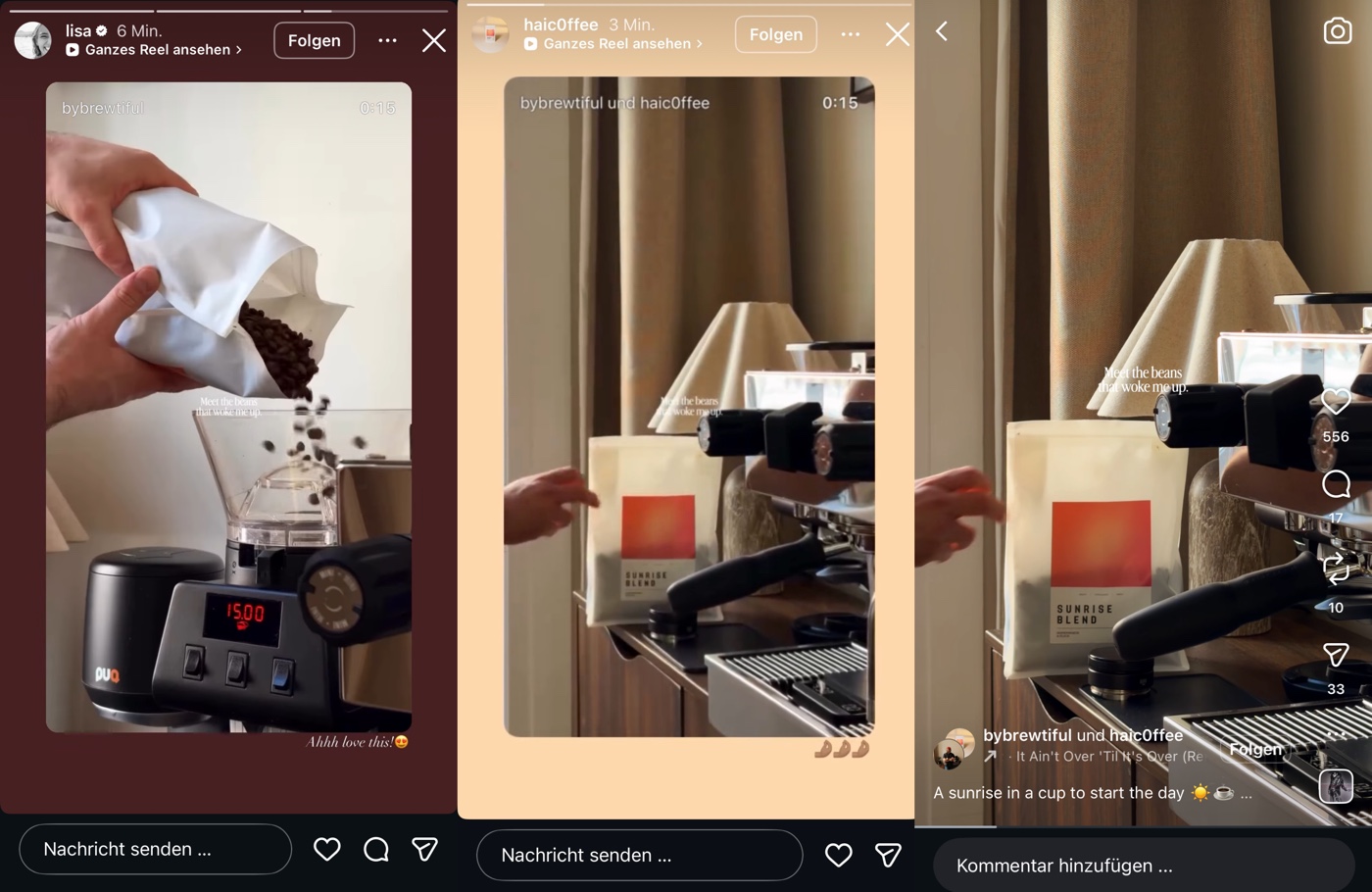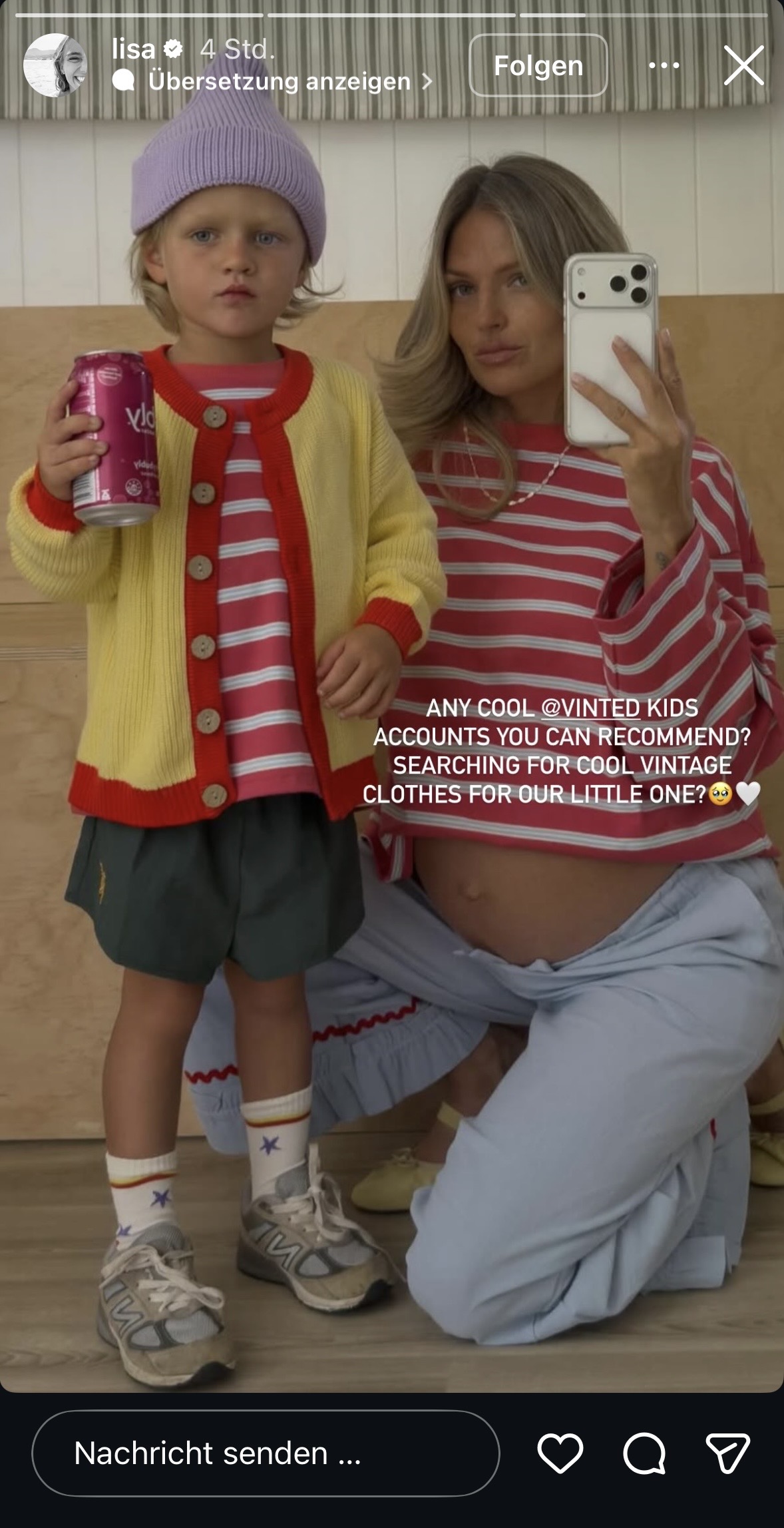 Bei Lisa werden in der Story heute wieder gesponserte Möbel und Klamotten unterschwellig platziert, mit ihren typischen Spiegel-Selfies … dann ihre Kaffeebohnen, als Collab-Reel mit ihrem Kaffee-Buisness – ohne Werbemarkierung – gefolgt von ebenfalls unmarkierte Story-Schleichwerbung für einen Vinted Klamotten Account, welcher verlinkt wird! Im Feed gibts today ein Collab mit Hubby: Wieder andere Klamotten werden da präsentiert und alle Marken in der Caption verlinkt.
