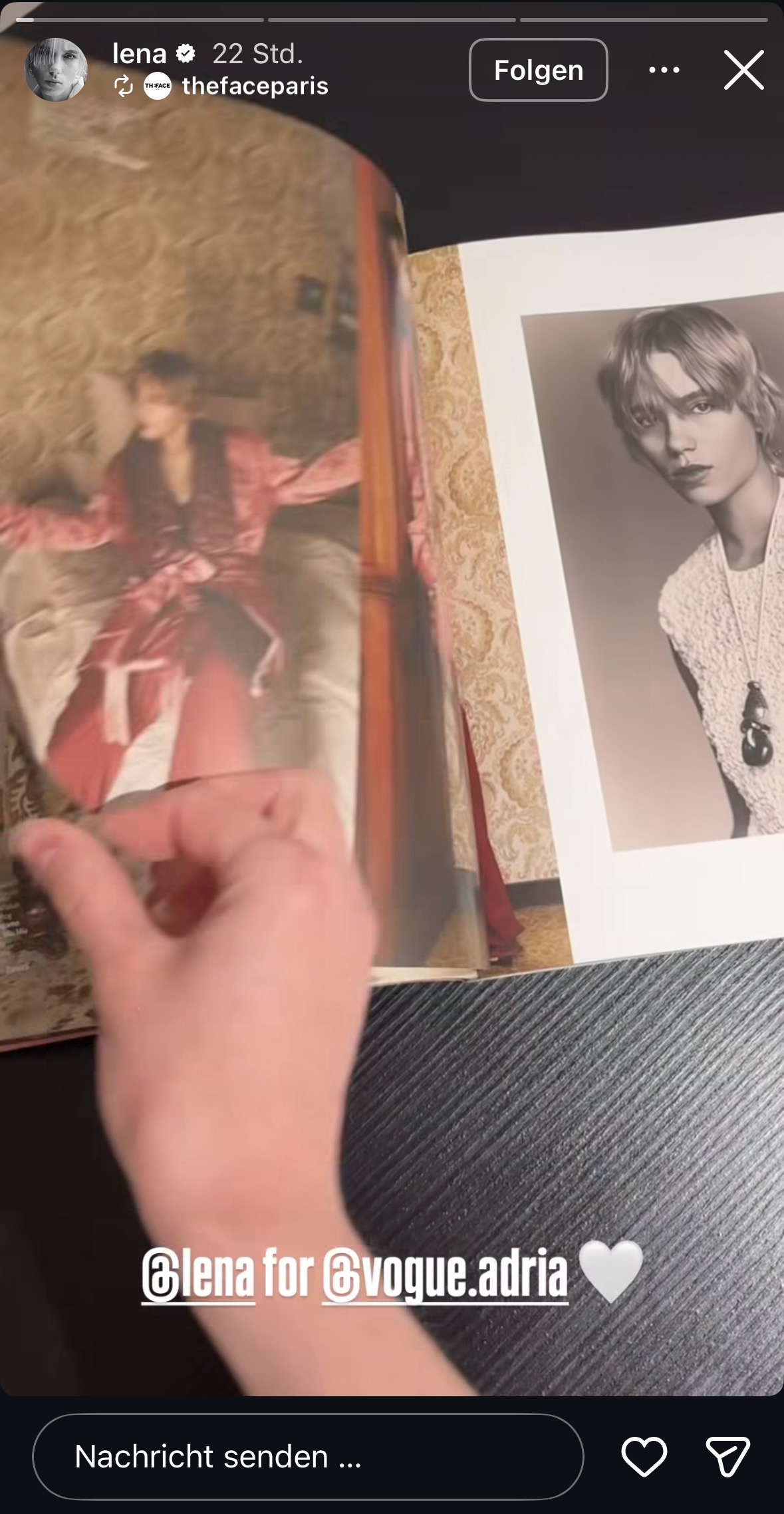 Lena ist auch kurz da … stumm und kontextfrei wie immer! Erinnert ihr euch an ihre – gefloppte – Kooperation mit der VOGUE ADRIA von vor 2 Wochen!? LOL! Da gibt es heute eine Erwähnung der dahinterstehenden Agentur, die unsere Lena natürlich (ohne jegliche Werbemarkierung) brav teilt. Wie gesagt, die Kooperation war der Flop schlechthin. Unglaublich wie betriebsblind ihre Agenturen sind!