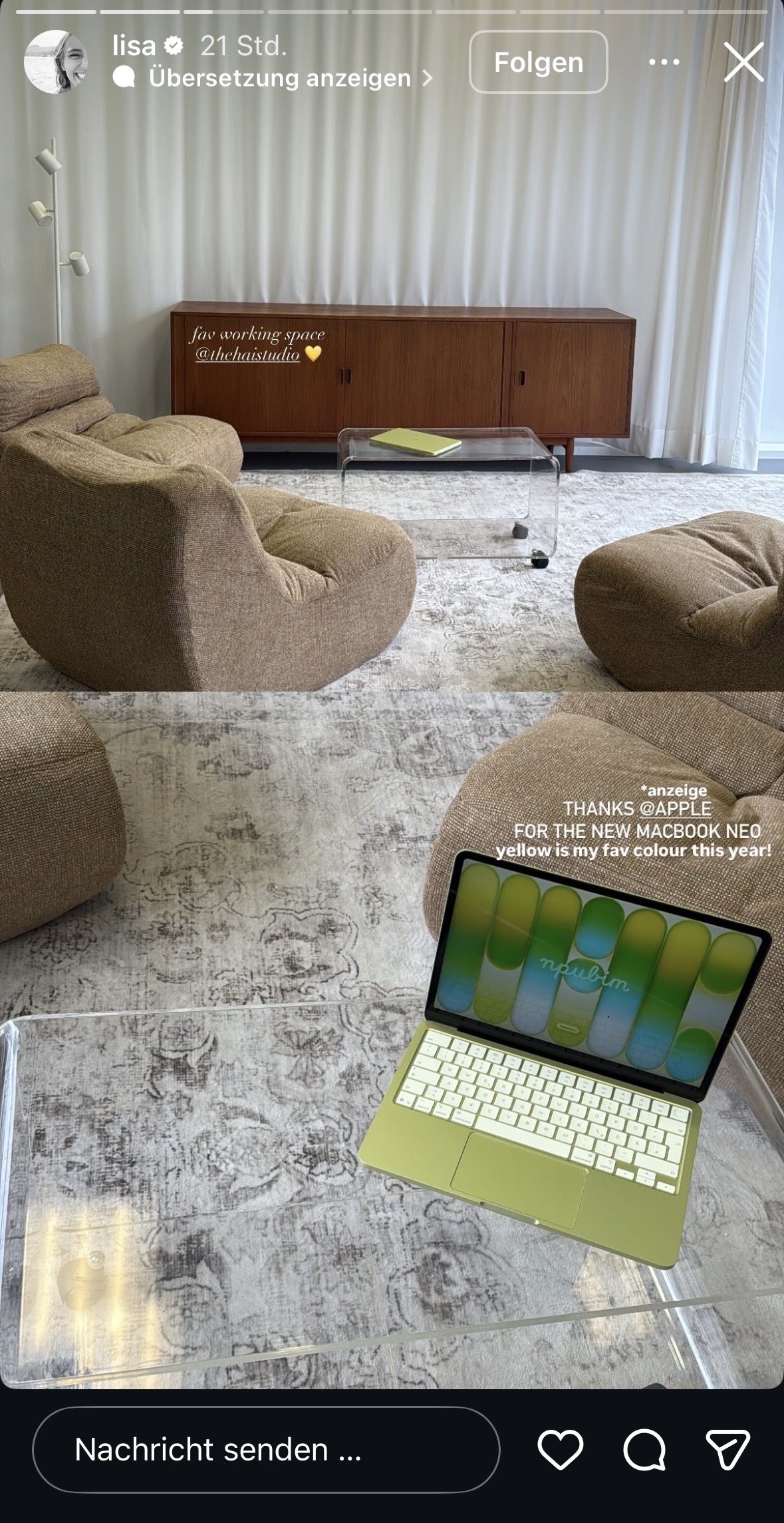 Mittwoch. Bei Lisa gibt es heute das volle Werbe-Programm. In der Story schon wieder Klamotten im Spiegel und auch als Feed-Posting zu bewundern – mit noch mehr Klamotten, Verlinkungen und ohne Werbekennzeichnung. Dann wird ihr Gewerbe unmarkiert verlinkt, … dann nochmal und ganz nebenbei wird ein neues MacBook präsentiert und Apple verlinkt. Klar doch, dass sie sich nicht nur alle ihre Möbel, sondern auch die Technik sponsern lässt – hat bei Lena ja auch schon funktioniert! Nun ja, weiter geht es jedenfalls mit der Platzierung von Kinderspielzeug und dann nochmal Layout aller platzierter Schleichwerbungen in einer Übersicht.