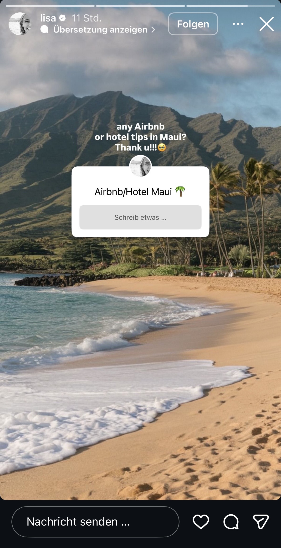 Bei Lisa gibt es derweil wieder Schmuck und Klamotten in der Story platziert, einmal alleine und einmal mit grinsenden Hubby – wie vermutet, wird im Hintergrund der nächste Urlaub schon geplant. Sie sucht mit einem Fragesticker ein AirBNB auf Maui (Hawaii) … als ob die 10-20 noch echten Fans da etwas dazu beitragen könnten. LOL! Wir wissen mittlerweile alle, das dies nur ein weiterer plumper Vorwand ist, um demnächst dann Schleichwerbung zu platzieren.
