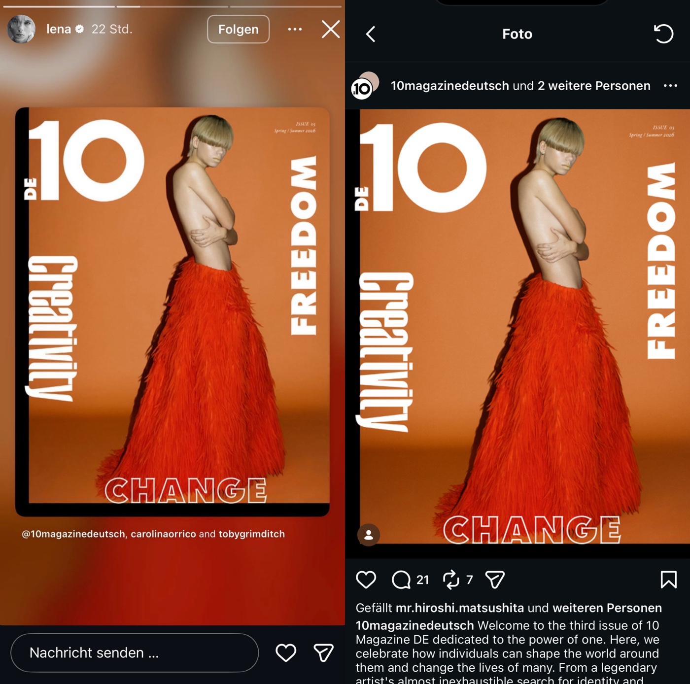 Samstag! Schauen wir doch mal was Lena´s neuste Kooperation … mit x-fachen Story Shoutouts, Feed Postings und Absetzen von Schein-Engagement nun eigentlich der Deutschen Niederlassung des Modemagazins effektiv eingebracht hat … also an neuen Followern, also an potenziellen neuen Käufern. Seit Donnerstag hat das Magazin noch 5 (!) weitere Postings abgesetzt, welche mit allen Beteiligten da und dem 1 Million Follower Hauptaccount des Magazins geteilt wurden. Es sind 21! 21 bei 21 Millionen Followern Reichweite … muhaha! Das Posting auf Lena´s Account floppt erwartungsgemäß bodenlos … ihre Freunde kommentieren fleißig, damit es bei den zum Glück ausgeblendeten Likes nicht ganz so schäbig aussieht.