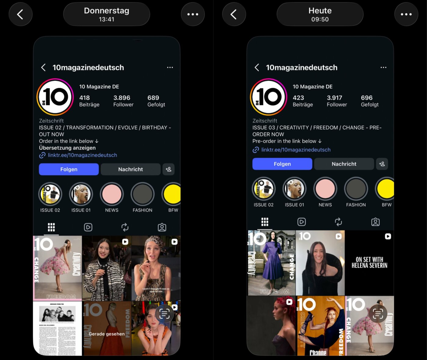 Weiter gehts dann nochmal mit einem Cover des Modemagazins von Gestern, bzw. das dazugehörige Ankündigungs-Posting auf deren Account, was Lena teilt. Scheint eine andere Ausgabe zu sein, … keine Ahnung, denn es gibt keinerlei Kontext dazu. Auch hier blendet man sicherheitshalber schon mal die Likes aus. Den Abschluss macht heute, das Teilen ihres neuen Feed-Postings! Die Modemagazin-Kooperation zieht damit nun auch bei Lena ein. Merkwürdige Fotos sind da zu sehen … die eher lächerlich wirken, als alles andere. Na ja, was tut man nicht alles (für Geld!). In jedem Fall ein kommerzielles Posting wieder, wo alle Beteiligten brav verlinkt werden … untermalt mir kommerzieller Musik, welche man dafür nicht verwenden dürfte … gekrönt von einer (mal wieder) fehlenden Werbekennzeichnung. Likes auch hier ausgeblendet!
