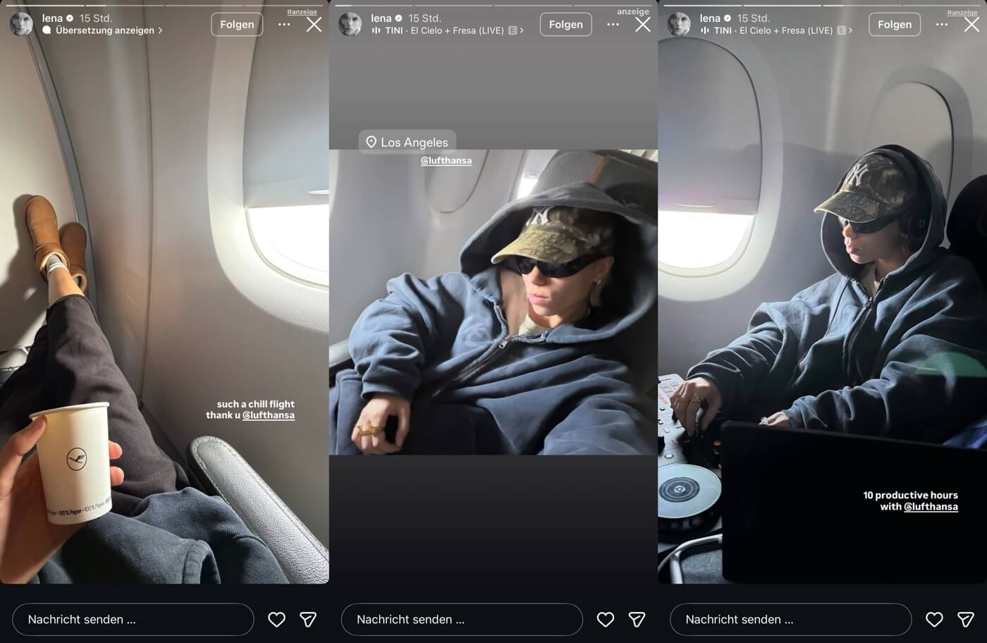 Wie großspurig but. Sprichwörtlich abgehoben willst du sein? Lena so: ja. Natürlich wird sie – gesponsert versteht sich – durch die Welt chauffiert, heute mit Lufthansa. Als Gegenleistung gibt’s die übliche Portion Dekadenz, geschniegelt inszeniert für die Story. Die Erfolgsquote solcher Kooperationen liegt aktuell bei rund 350 Interaktionen außerhalb ihrer eigenen Bubble. Einfach mal im Hinterkopf behalten – dann wirkt das Ganze gleich noch ein gutes Stück grotesker.