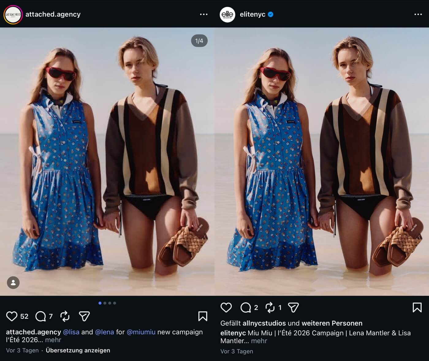 Letztes Jahr im Herbst gab es ja ein gemeinsames Shooting mit Lisa und Lena zusammen am Strand. Das beide nun die selbe Agentur haben und man ihre Fake-Bubble fortan doppelt vermarkten wird, ist mittlerweile ja offensichtlich … heute schließt sich hier wieder ein Kreis. Beide kommen mit einer neuen Werbe-Kampagne heute um die Ecke. Es geht um die neue MiuMiu Kampagne, für die damals also geshootet wurde. Beideteilen heute demnach Reels und ein Collab Posting mit der Marke und Lena in ihren Storys – Werbemarkierungen fehlen natürlich wieder systematisch! Wirklichen Kontext oder mal was persönlich authentisches dazu, kommt selbstredend auch nicht … genauso wenig wie daraufhin authentisches Feedback ihrer angeblichen Millionen-Reichweite zu erwarten ist. Eine weitere inszenierte Mogelpackung also! Dass die Fotos absolut lächerlich aussehen und die Preise fernab jeder Realität irgendwelcher Fan-Zielgruppen sind, allen auch egal. Wie immer – Geld stinkt nicht! Wichtig ist Lisa dann noch Klamotten, die sie damals in einem Posting schleichbeworben hatte, heute nochmal unter Vorwand in die Story zu teilen („I can finally share why I needed some Polas…“). Juckte damals schon keinen (Hälfte der generierten Kommentare auch von ihr selbst) – als ob das jetzt noch was an Engagement bringen würde!? LOL! Fassen wir es kurz zusammen: Wie alle anderen bisherigen MiuMiu Kooperationen, … oder allen Kampagnen … wird auch das nix werden! Sonnenklar!