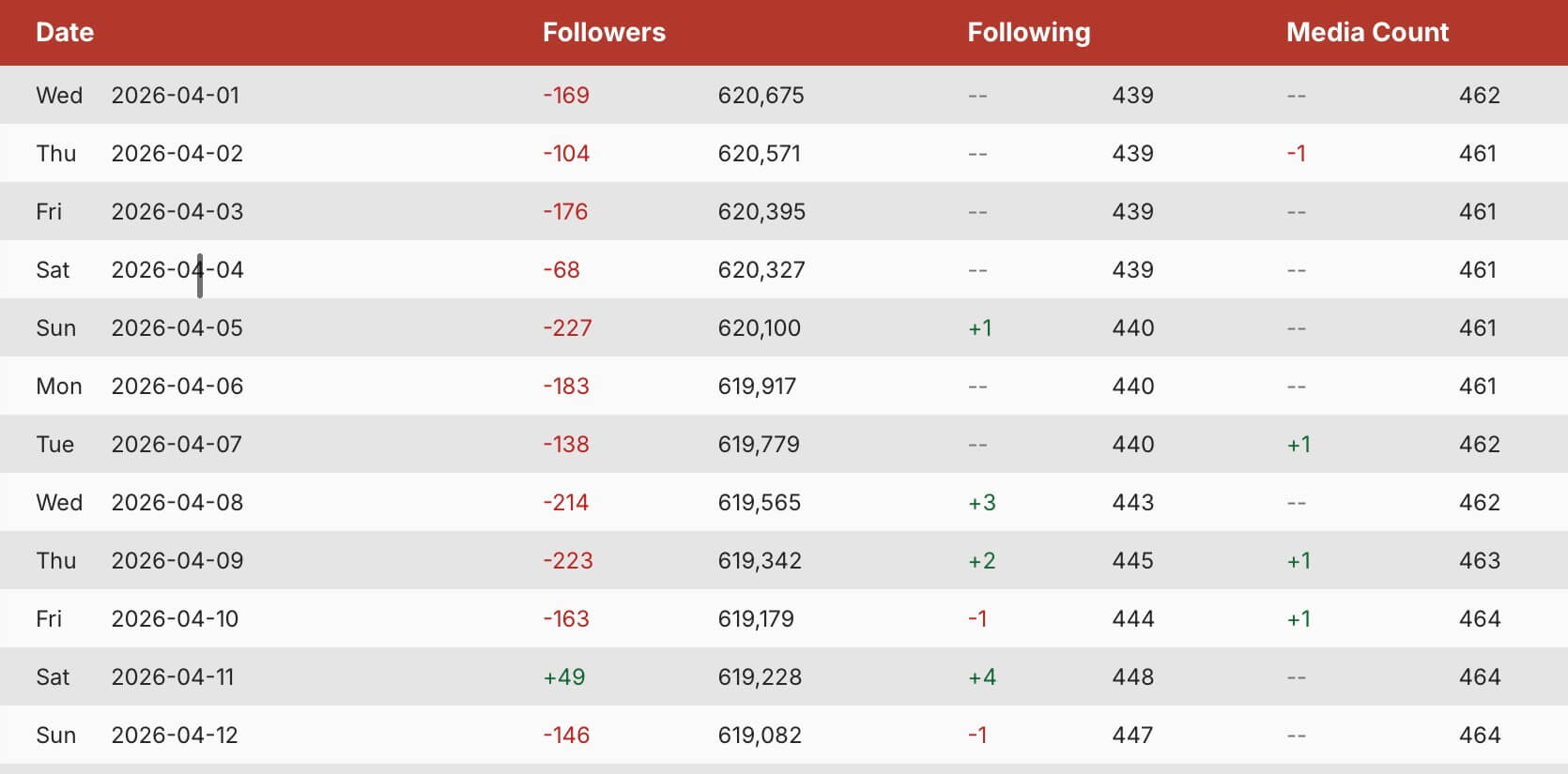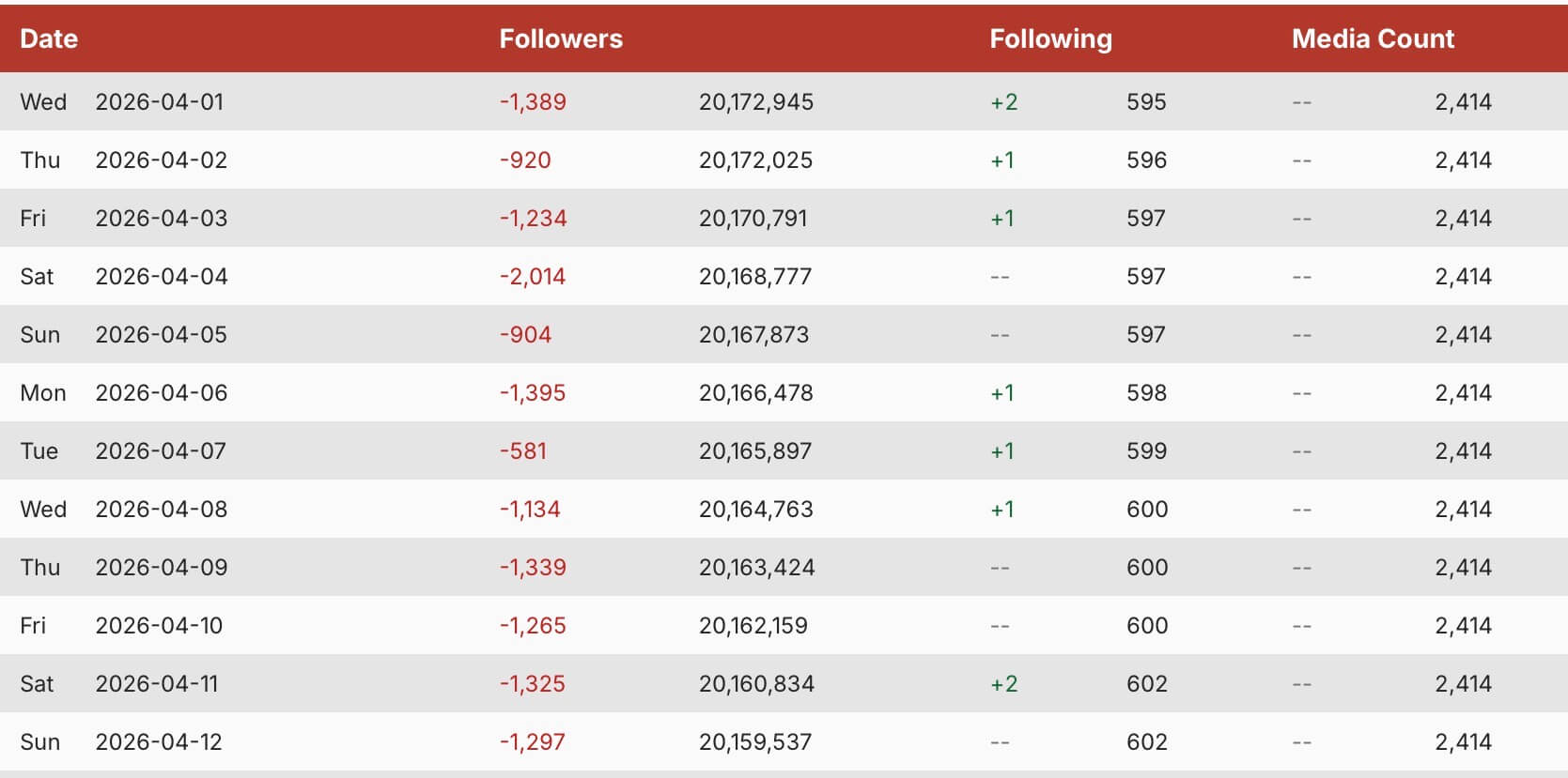 Das i-Pünktchen sind dann noch die Followerzahlen: Nachdem unsere Multi-Unternehmerin die ganze Woche lang mehrere hundert Follower pro Tag verloren hat, wurde Samstag urplötzlich ein Plus verzeichnet … welches aber direkt am Sonntag wieder eingebrochen ist! LOL! Es bleibt letztendlich damit erneut bei über 1000 Follower minus diese Woche (Quelle: Socialblade).