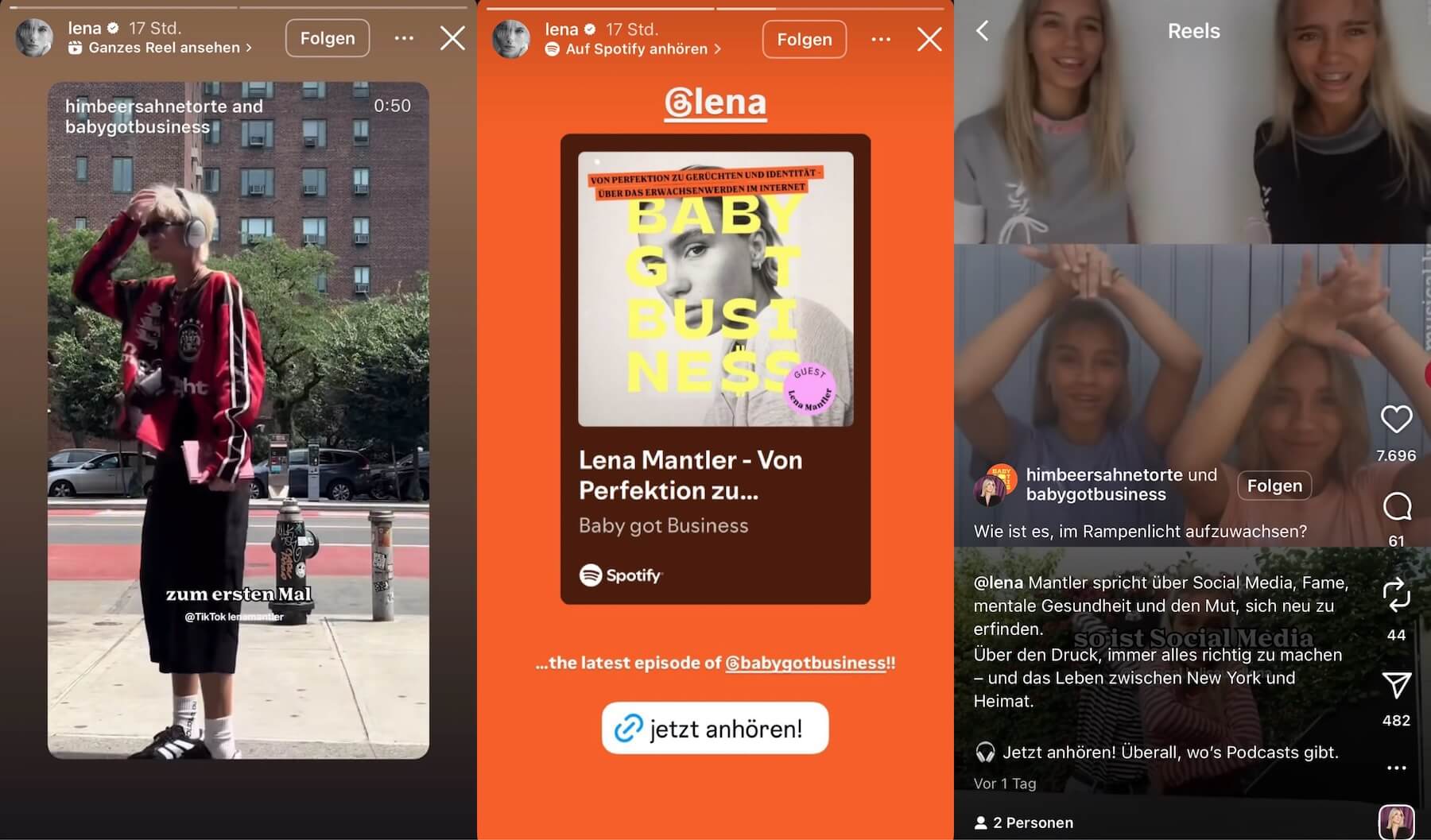 Getroffen wurde sich im Spotify Office in NewYork. Den Podcast moderiert Ann-Katrin Schmitz – jemand, der die Branche tatsächlich kennt. Sie hat schon mit einer Menge (echter) Influencer gearbeitet, Events organisiert (unter anderem mal in Hamburg, wo auch Lena’s Agenturchefin anwesend war) und ist uns bspw. als Speakerin des diesjährigen OMR Festivals bekannt, wo wir sie auch persönlich mal kennengelernt hatten. Kurzum: Eine Frau vom Fach trifft auf eine Lena Mantler. Gleich zu Beginn stellt Ann-Katrin daher klar, dass sie schon mit vielen Gesichtern aus dem Influencer-Kosmos zu tun hatte – nur mit Lena bisher nicht. Dass sie (wohl laut Agenturbriefing) ausgerechnet die „reichweitenstärkste“ von allen sein soll, sorgt bei ihr hörbar für leichte Verwunderung.