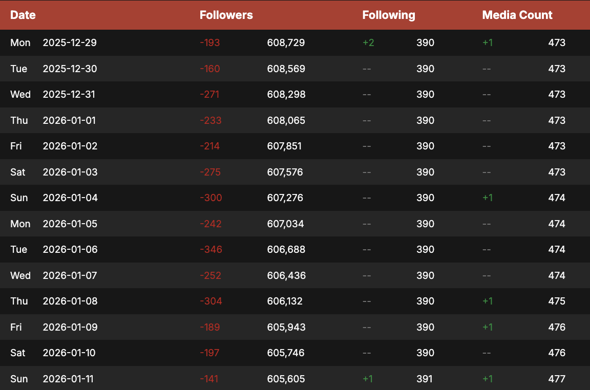 Bei Lena gibt es heute wieder stumm Klamotten in der Story platziert und ihre Marke teilt eine Story der Agenturmitarbeiterin, die sich über ein weiteres Gratispaket freut. LOL! Ja, man kann sich Lena´s Wochenbilanz eigentlich sparen – das Ergebnis ist ohnehin jedes Mal dasselbe. Ein dekadenter Lifestyle auf Kosten anderer, getragen von einem gigantischen Luftschloss, wie eh und je! Dass ihre Followerzahlen völlig unabhängig von konkreten Ereignissen permanent Achterbahn fahren, bestätigt diesen „SCAM“-Eindruck Woche für Woche aufs Neue. Unterm Strich bleibt alles gleich: auch diese Woche wieder über 11.000 verlorene Follower (Quelle: Socialblade).