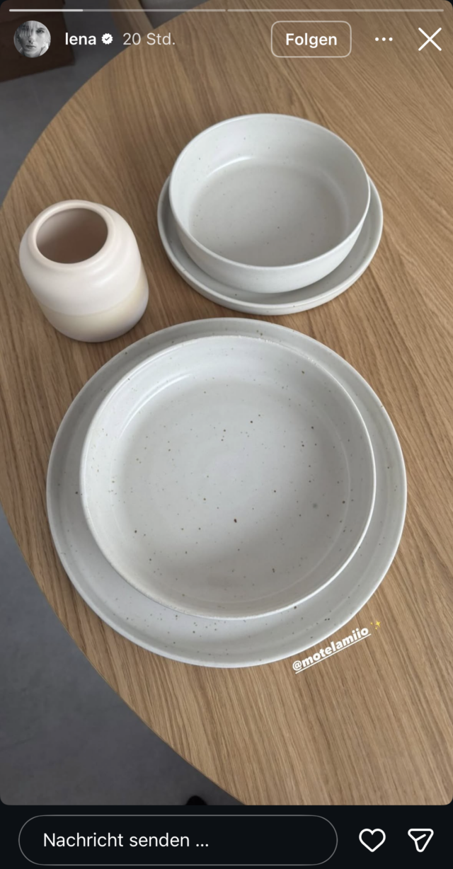 Während eine Klamottenbewerbung noch vor sich hin floppt, startet Lena am Samstagdirekt die nächste. Vorgehensweise: exakt dieselbe wie immer. Bonus-Content diesmal offenbar gesponsertes (vorher noch nie dagewesenes) Keramik-Geschirr von Motel a Miio – kontextfrei in der Story platziert. Kohle dafür abgegriffen, da Marke verlinkt – Kommunikation gleich null. Werbekennzeichnung? Natürlich wieder nicht!