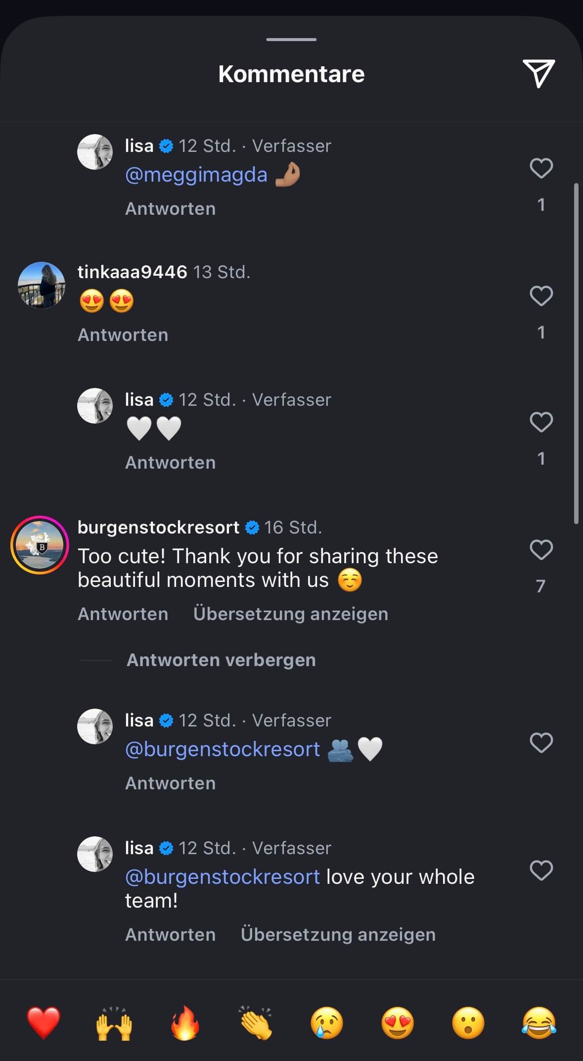 Das Resort selbst hat über 300.000 Follower und teilt Lisas Storys schon Tage lang fleißig – angeblich erreichen die Clips so rund eine Million Augenpaare. Theoretisch! Das Ergebnis bisher ? Nicht mal 7.000 Likes und ganze 6 (!) Kommentare. Ein eher… überschaubarer Erfolg – wie absolut üblich! Der Snapshot stammt übrigens von Mitternacht und im Laufe der Nacht geschah dann das, was man inzwischen schon fast erwartet: Der obligatorische „Lisa-Effekt“ wurde aktiv! Am Samstagvormittag standen plötzlich rund 14.000 Likes auf dem Posting. Offenbar waren da außergewöhnlich viele Nachtschwärmer unterwegs. LOL! Trotz dieses nächtlichen Aufschwungs kamen am Ende trotzdem kaum mehr als rund 20 Kommentare zusammen – und das auch nur, weil Lisa wirklich jedem Kommentar brav geantwortet hat … manchmal sogar zweimal. Ein Trauerspiel sondergleichen!