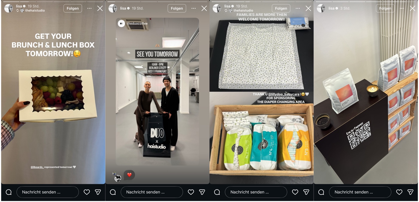 Lisa ist auch wieder back in Business und repostet in ihrer Story ein Reel als Collab mit Business Nummer 3 und einer weiteren Marke, die wohl für das Branding zuständig ist. Es werden jedenfalls zusammenfassend wieder allerlei Marken gezeigt, verlinkt und beworben – selbstverständlich ohne jegliche Kennzeichnung als Werbung.