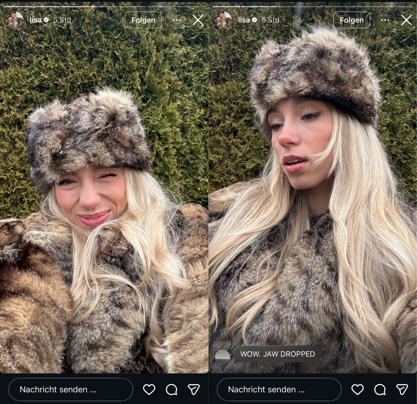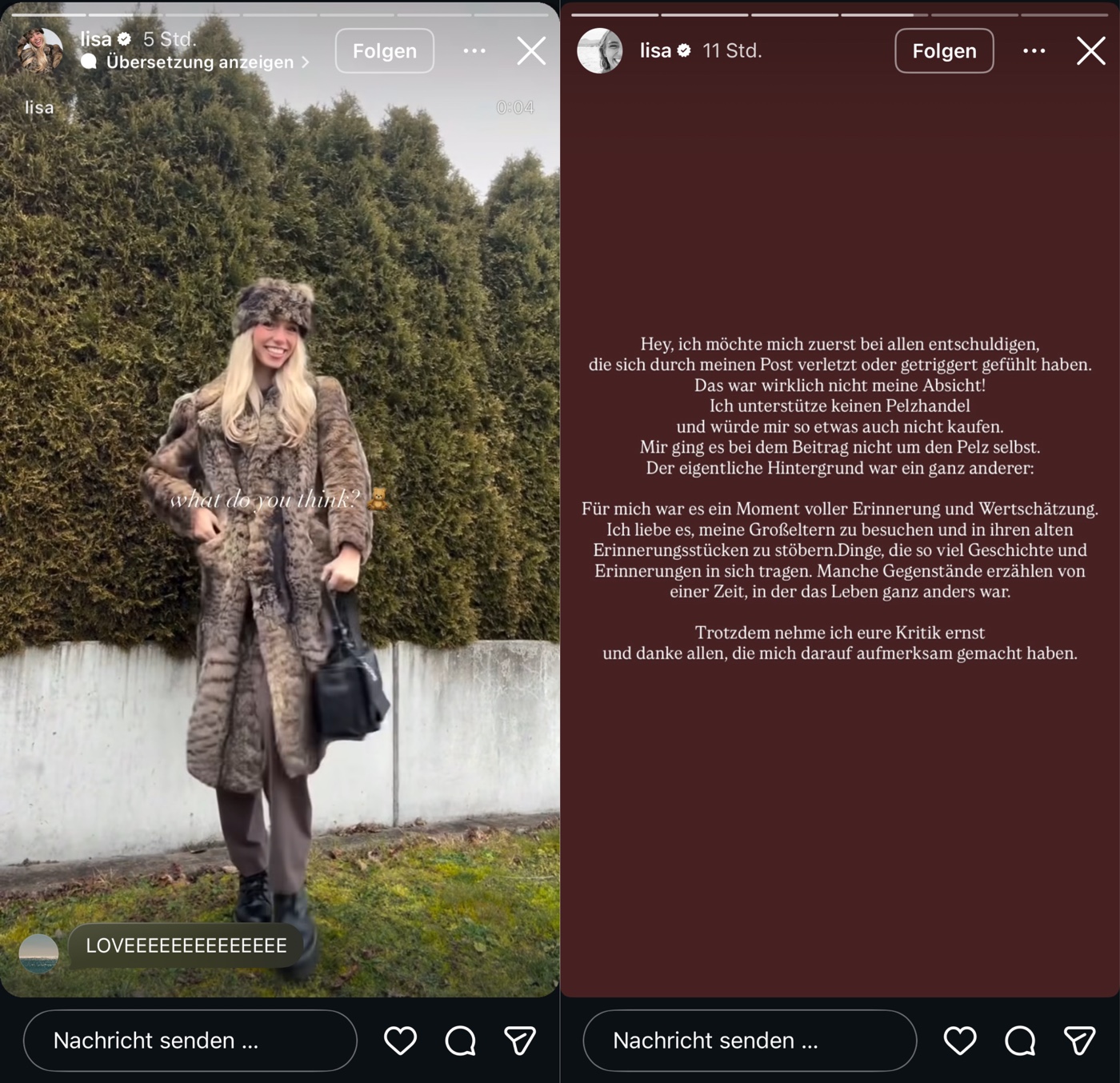 Es geht, wie soll es auch sein, komplett nach hinten los und unsere Lisa rudert zurück. Der Pöbel, bzw. die paar echten Kommentatoren – die noch zugegen sind, finden es (richtigerweise) nämlich nicht so dolle, wenn man sich heutzutage dekadent in Tierfelle hüllt und es artet in einem kleinen Shitstorm aus. Lisa löscht daraufhin die Storys und Postings und entschuldigt sich dafür. Die schleichbeworbenen Schuhe und die Tasche bleiben selbstverständlich weiter online! business as usual …